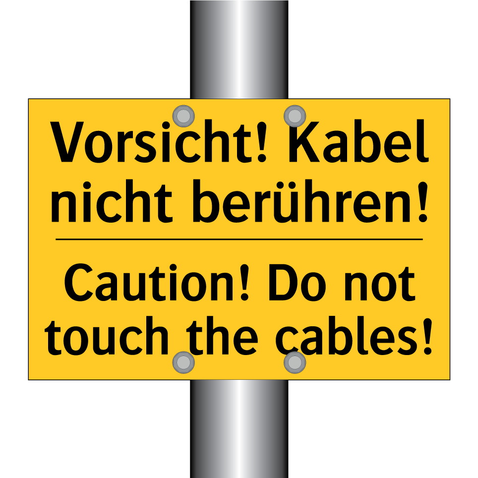 Zweisprachiges Warnschild mit deutschem Text Vorsicht! Kabel nicht berühren! und englischem Text Caution! Do not touch the cables!