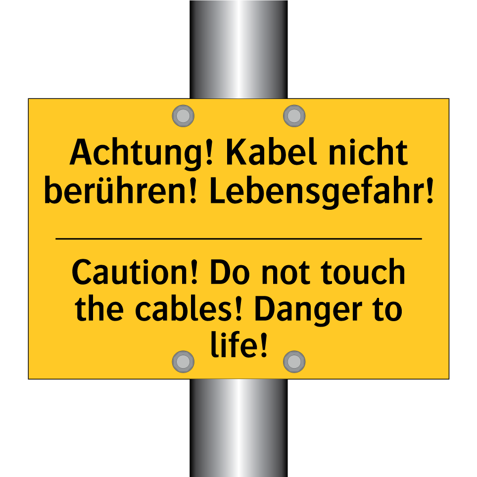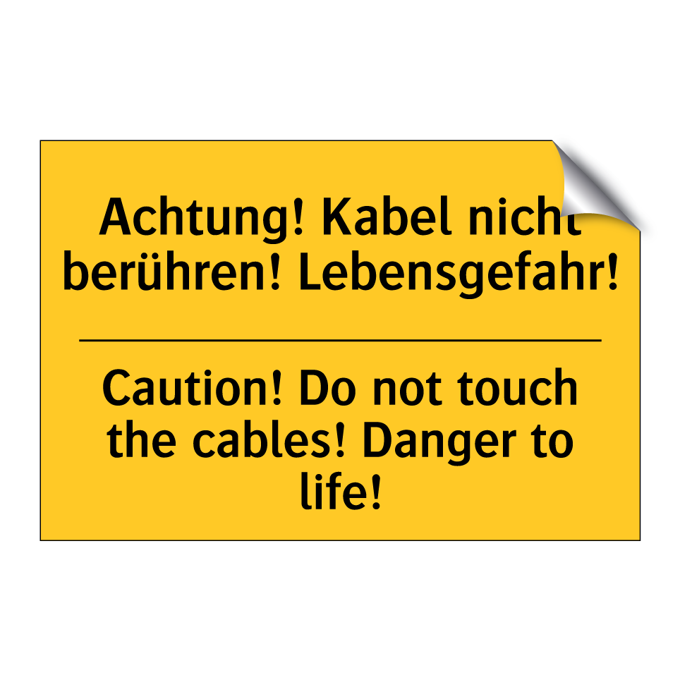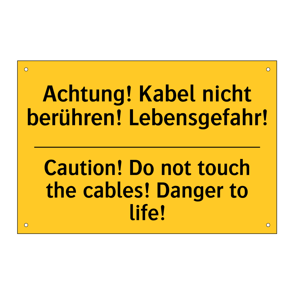 Zweisprachiges Warnschild mit deutschem Text Achtung! Kabel nicht berühren! Lebensgefahr! und englischem Text Caution! Do not touch the cables! Danger to life!