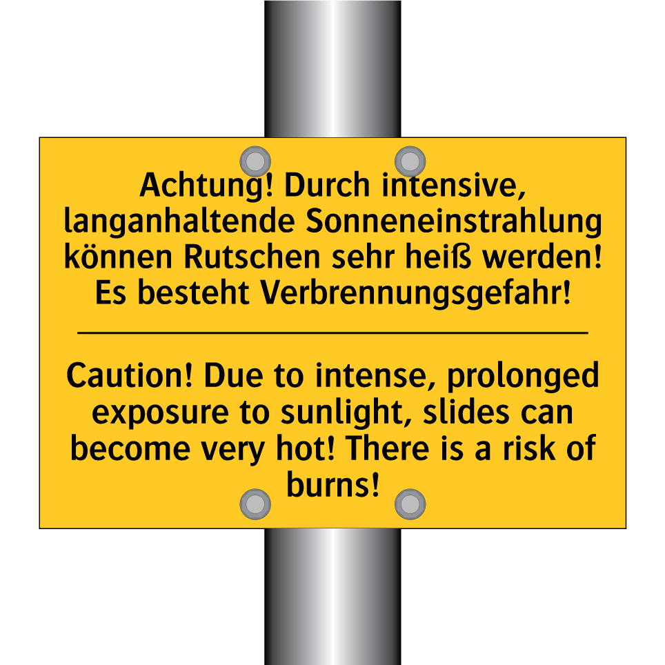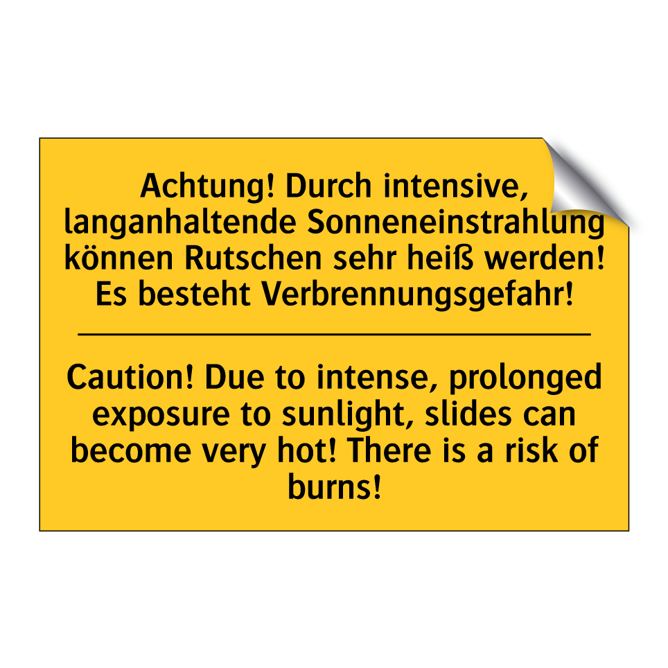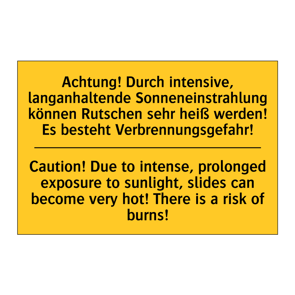 Zweisprachiges Warnschild mit deutschem Text Achtung! Durch intensive, langanhaltende Sonneneinstrahlung können Rutschen sehr heiß werden! Es besteht Verbrennungsgefahr! und englischem Text Caution! Due to intense, prolonged exposure to sunlight, slides can become very hot! There is a risk of burns!