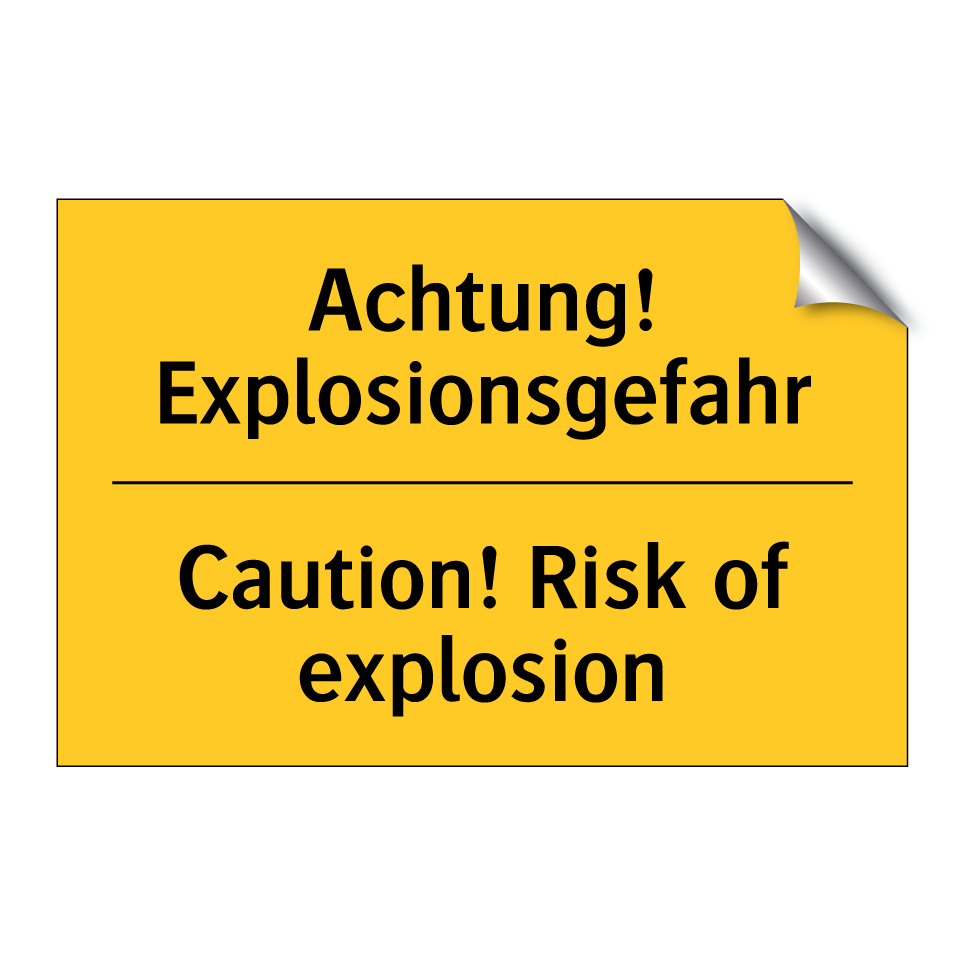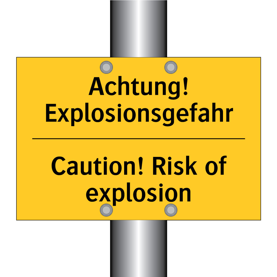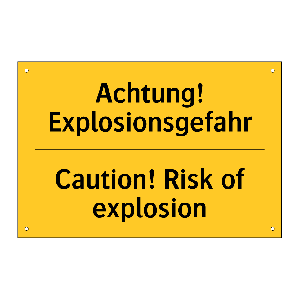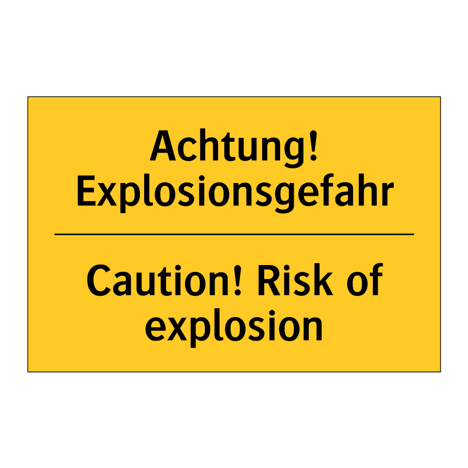 Zweisprachiges Warnschild mit deutschem Text Achtung! Explosionsgefahr und englischem Text Caution! Risk of explosion