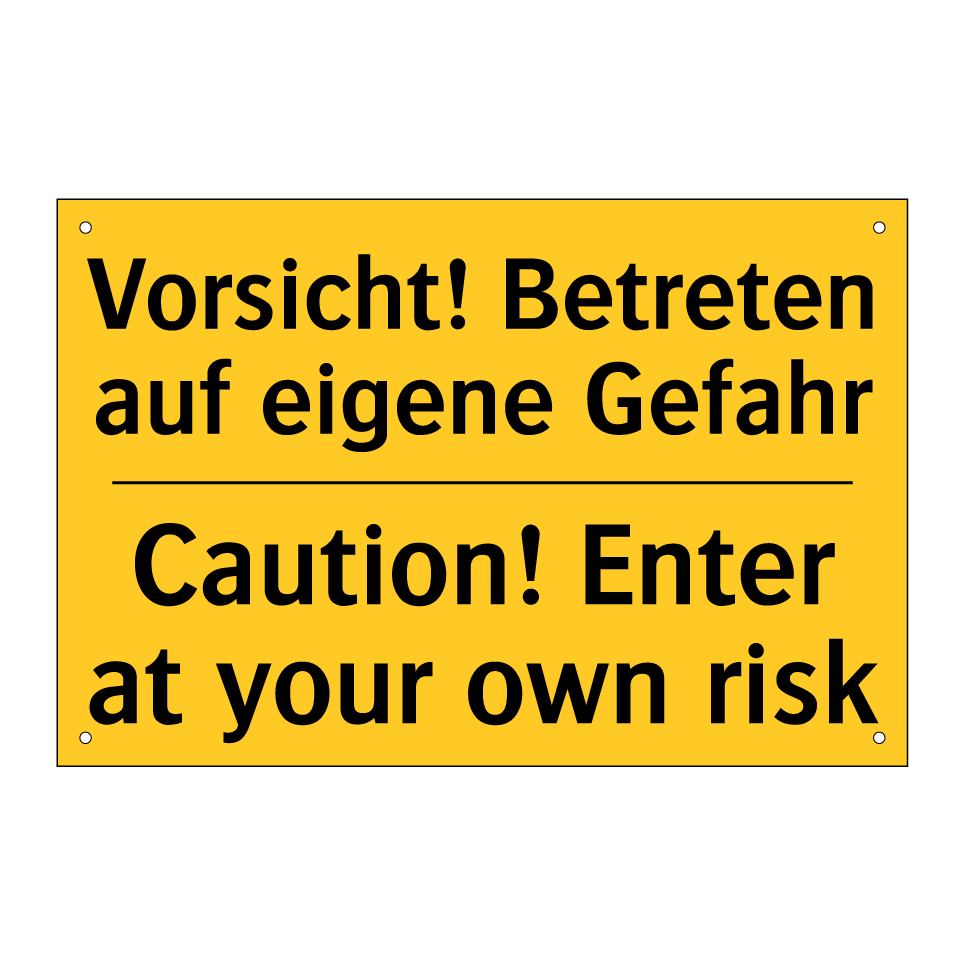 Zweisprachiges Warnschild mit deutschem Text Vorsicht! Betreten auf eigene Gefahr und englischem Text Caution! Enter at your own risk