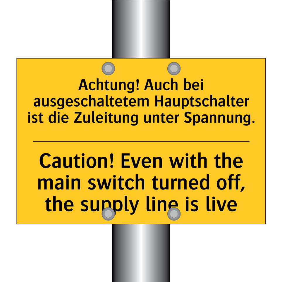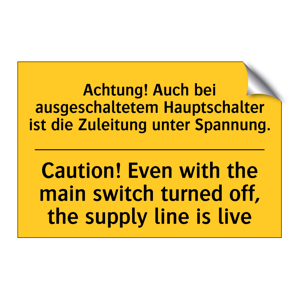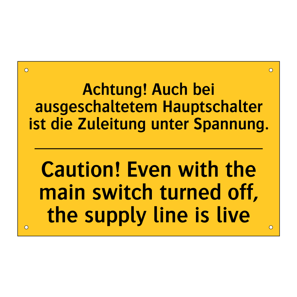 Zweisprachiges Warnschild mit deutschem Text Achtung! Auch bei ausgeschaltetem Hauptschalter ist die Zuleitung unter Spannung. und englischem Text Caution! Even with the main switch turned off, the supply line is live