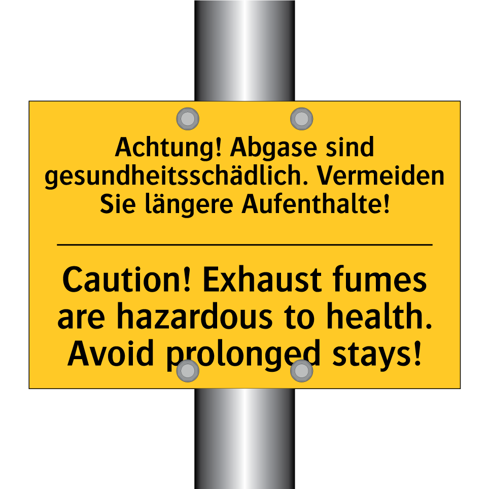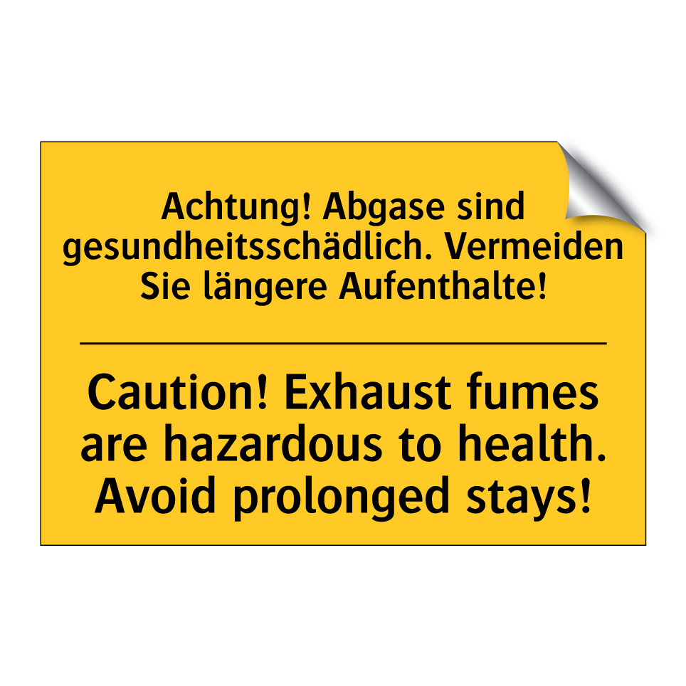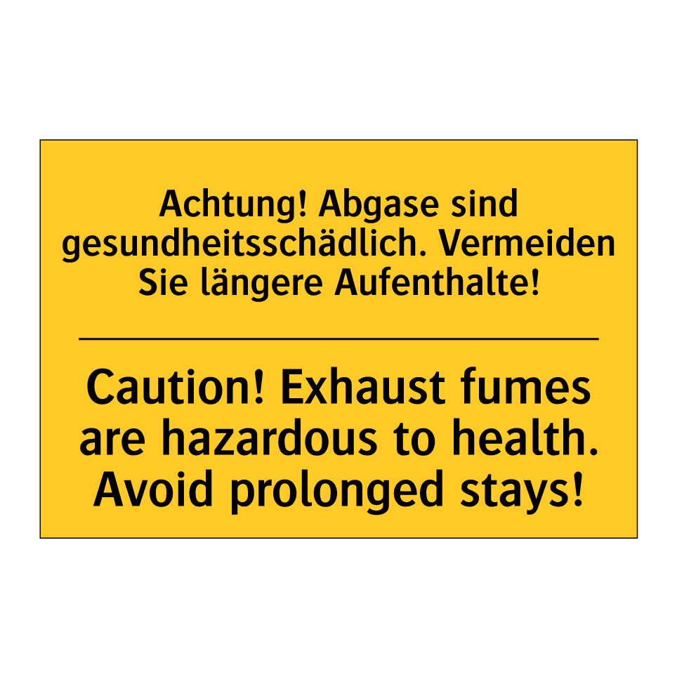 Zweisprachiges Warnschild mit deutschem Text Achtung! Abgase sind gesundheitsschädlich. Vermeiden Sie längere Aufenthalte! und englischem Text Caution! Exhaust fumes are hazardous to health. Avoid prolonged stays!