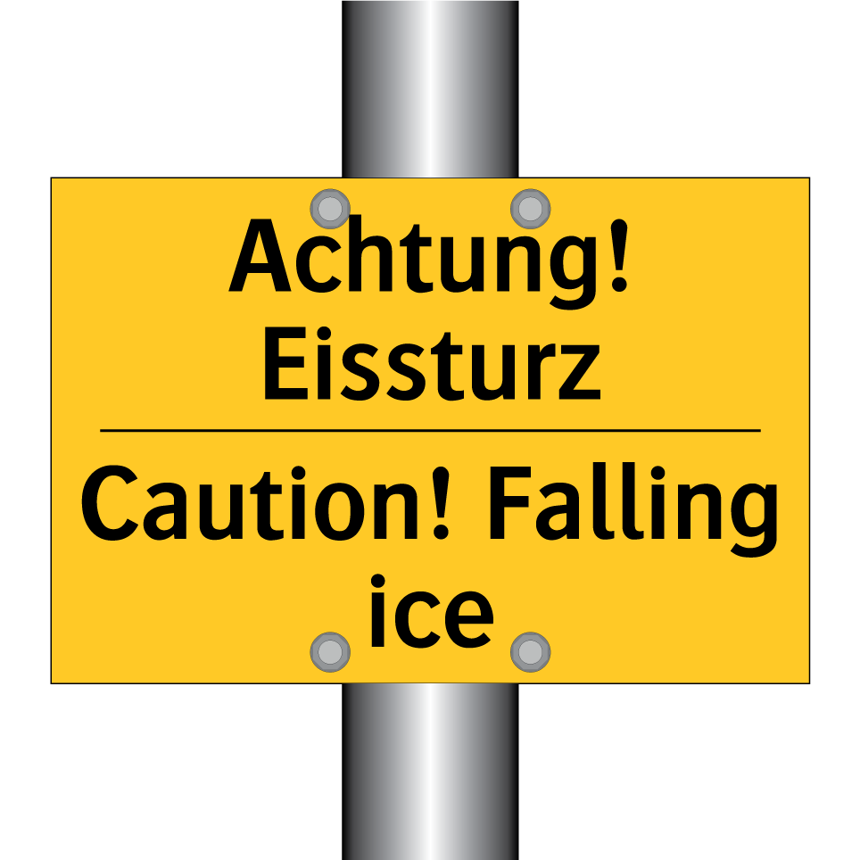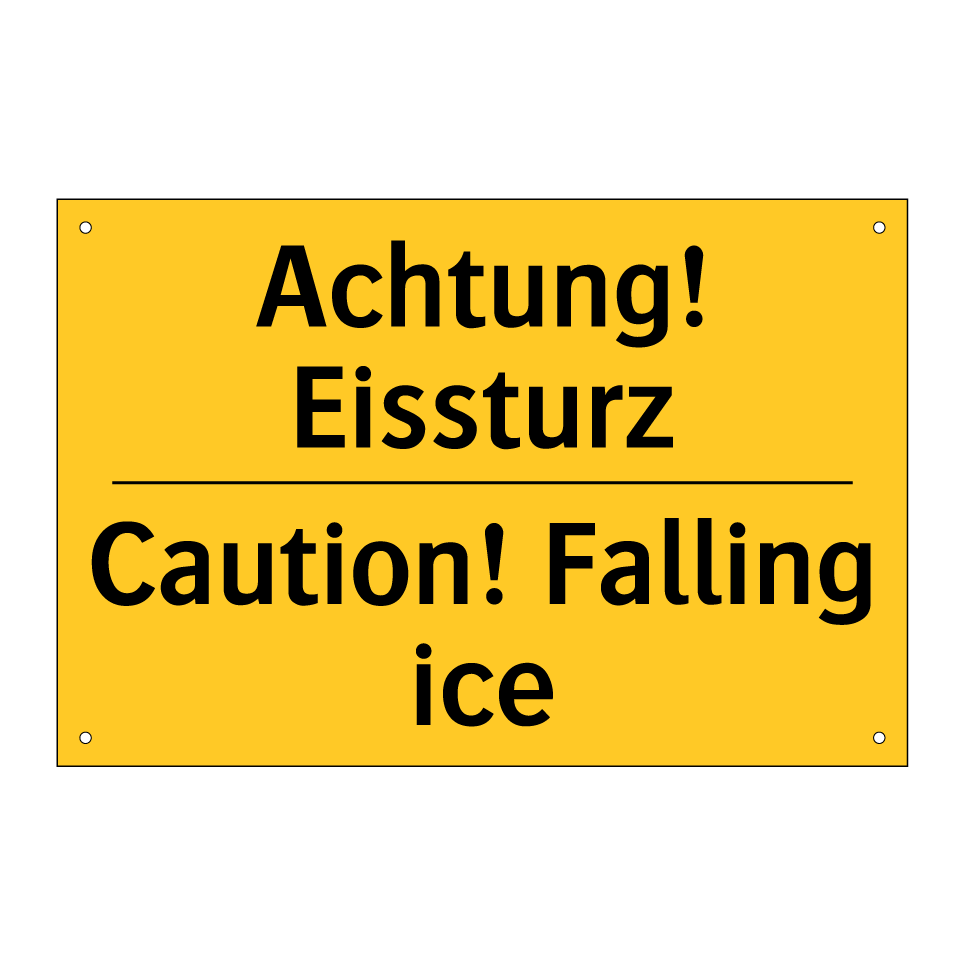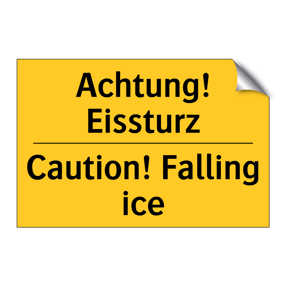 Zweisprachiges Warnschild mit deutschem Text Achtung! Eissturz und englischem Text Caution! Falling ice