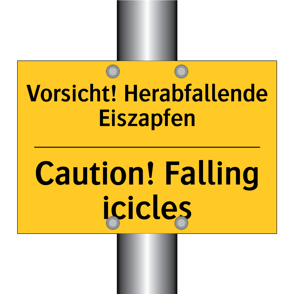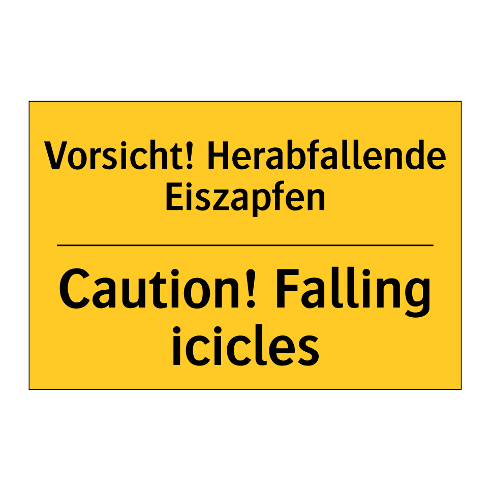 Zweisprachiges Warnschild mit deutschem Text Vorsicht! Herabfallende Eiszapfen und englischem Text Caution! Falling icicles