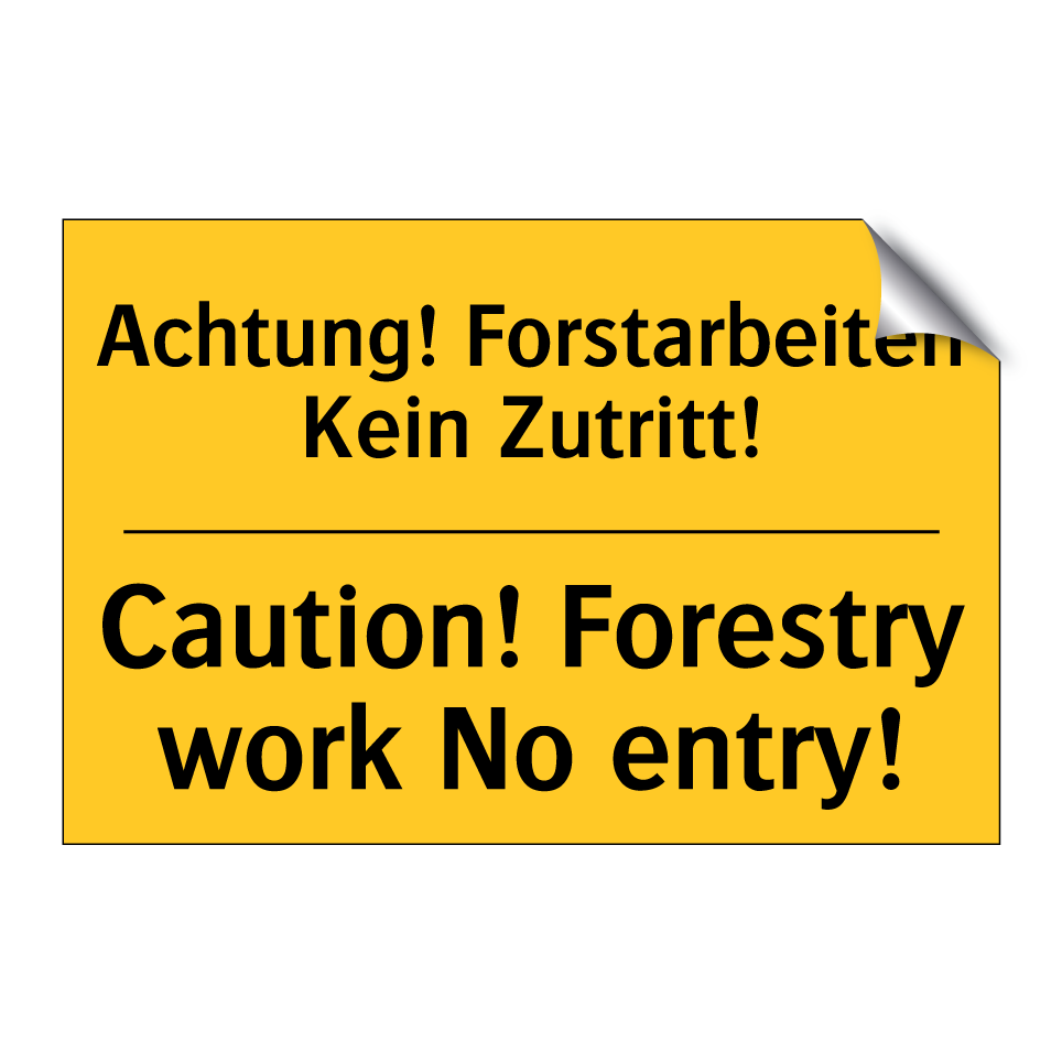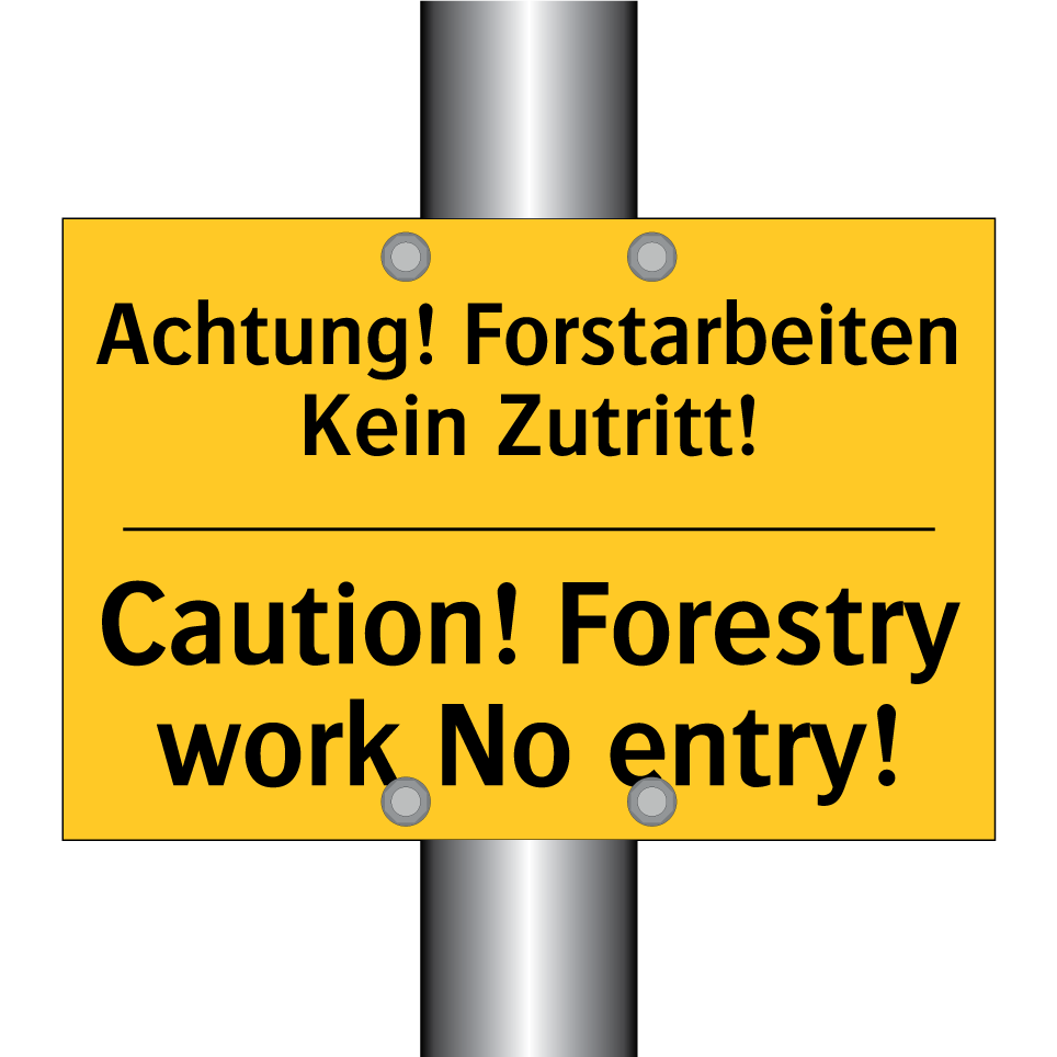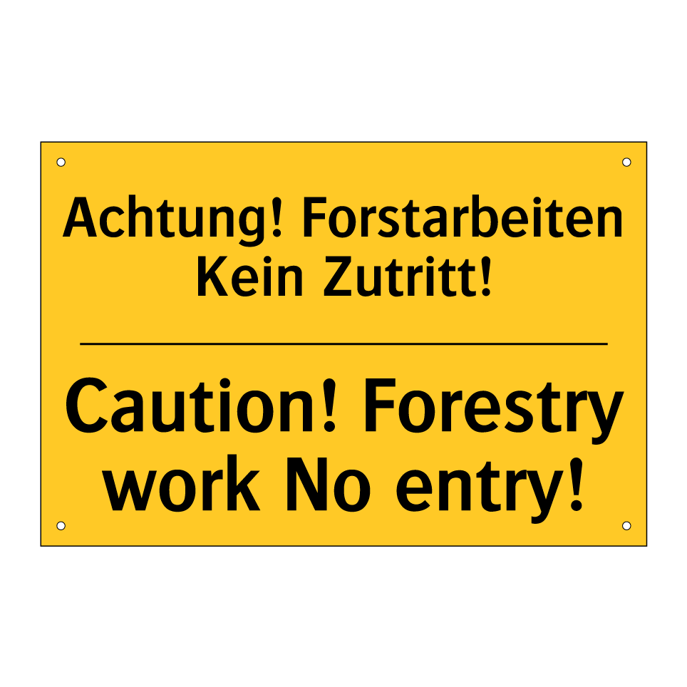 Zweisprachiges Warnschild mit deutschem Text Achtung! Forstarbeiten Kein Zutritt! und englischem Text Caution! Forestry work No entry!