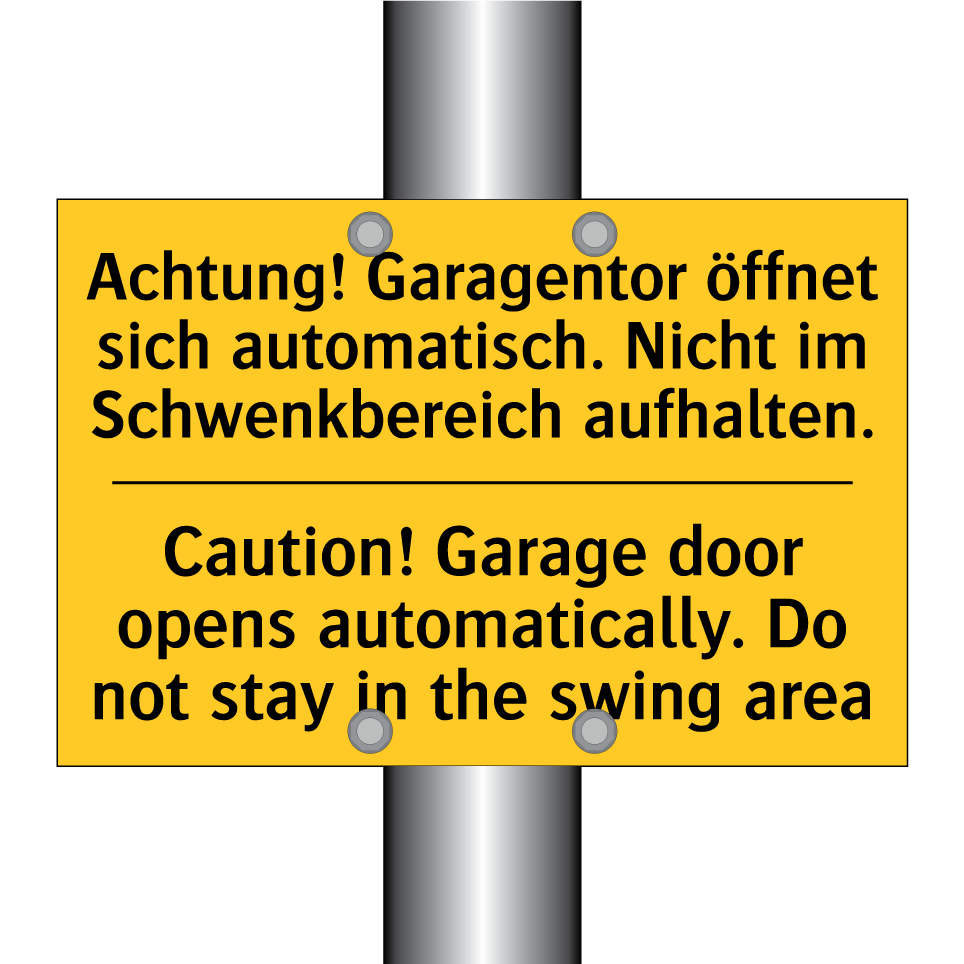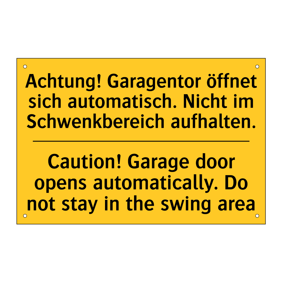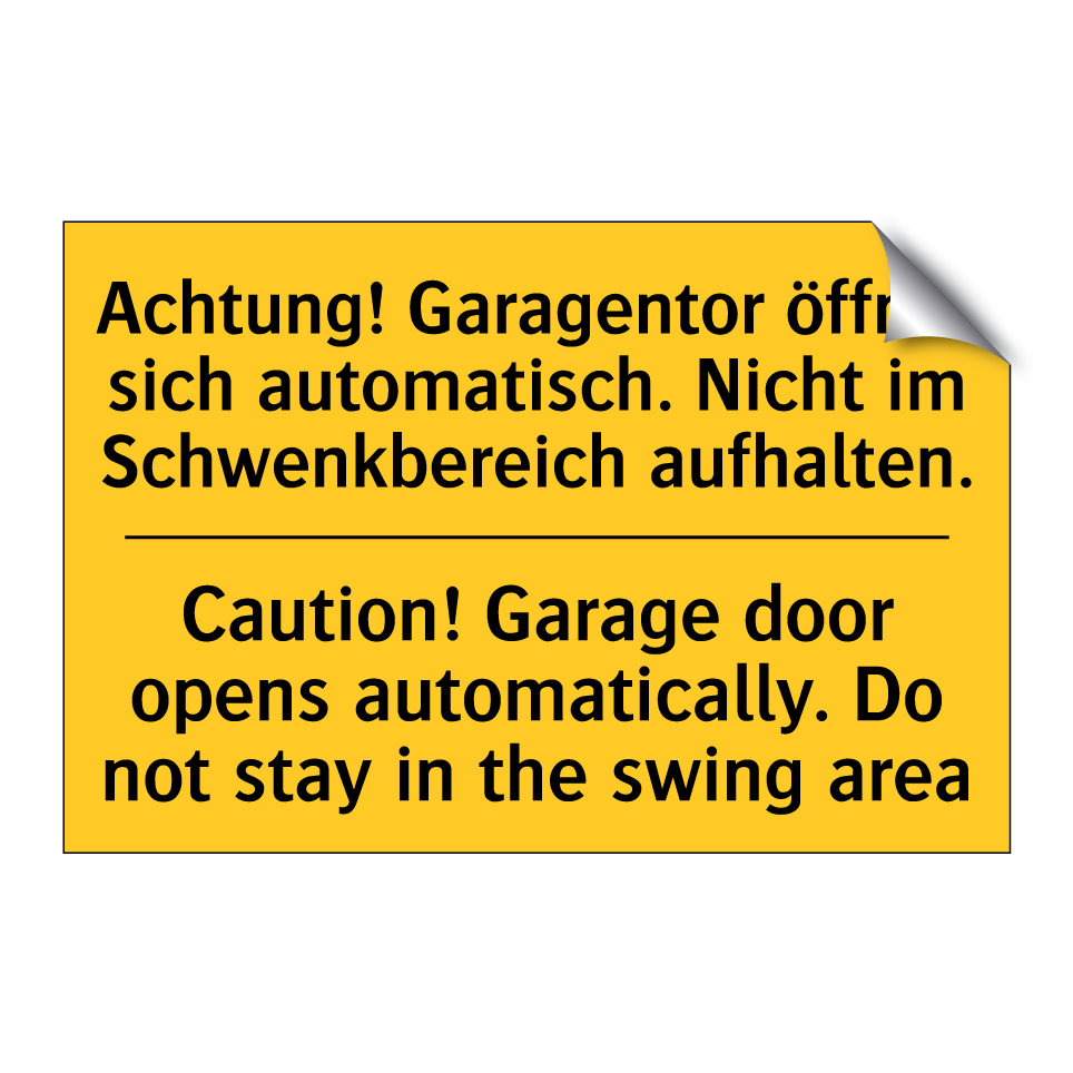 Zweisprachiges Warnschild mit deutschem Text Achtung! Garagentor öffnet sich automatisch. Nicht im Schwenkbereich aufhalten. und englischem Text Caution! Garage door opens automatically. Do not stay in the swing area