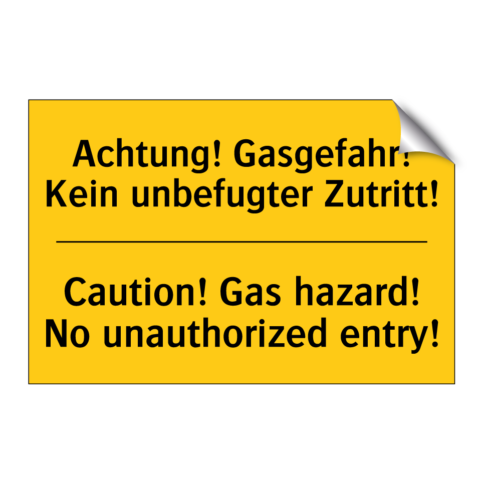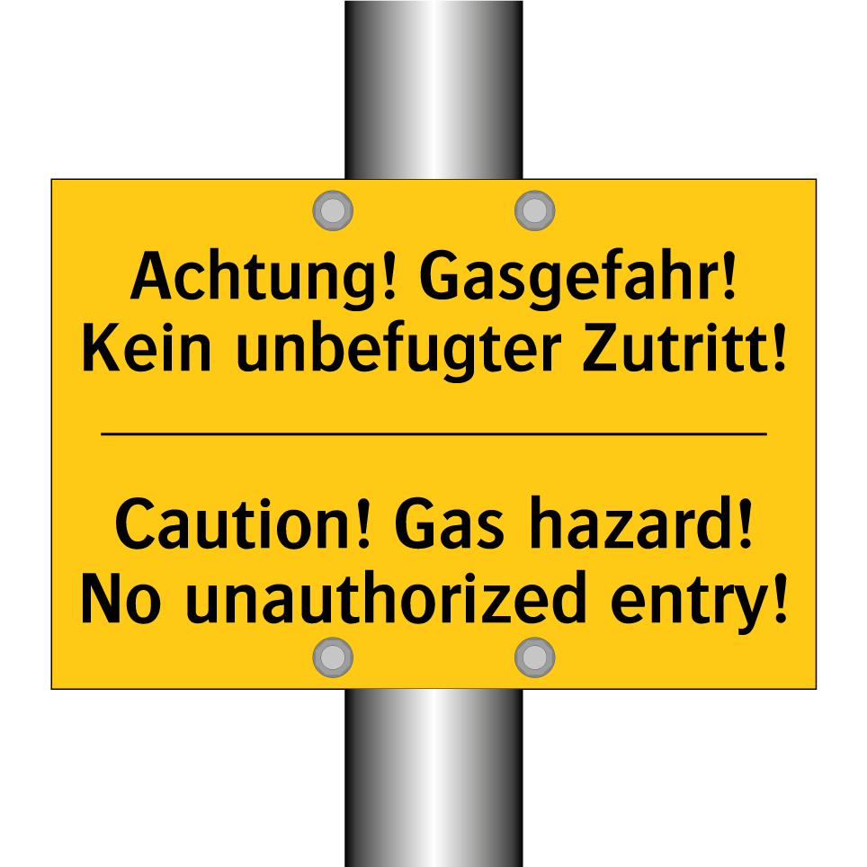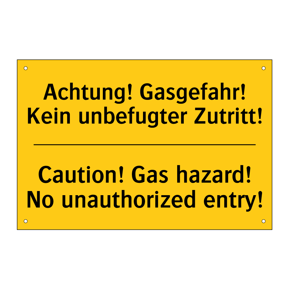 Zweisprachiges Warnschild mit deutschem Text Achtung! Gasgefahr! Kein unbefugter Zutritt! und englischem Text Caution! Gas hazard! No unauthorized entry!