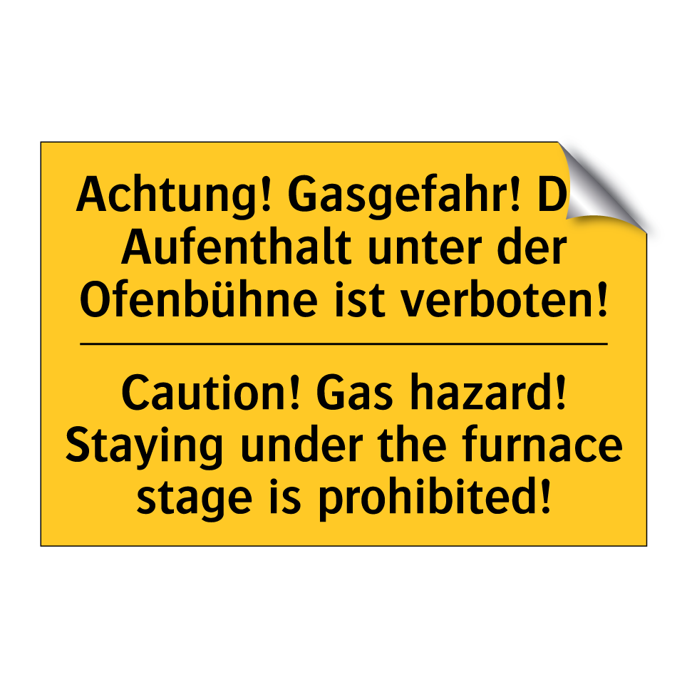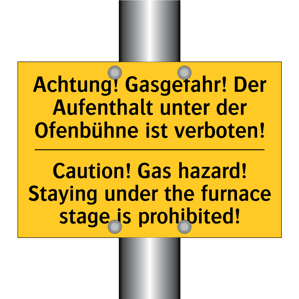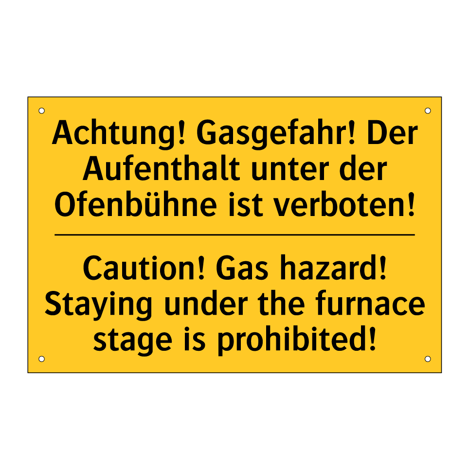 Zweisprachiges Warnschild mit deutschem Text Achtung! Gasgefahr! Der Aufenthalt unter der Ofenbühne ist verboten! und englischem Text Caution! Gas hazard! Staying under the furnace stage is prohibited!
