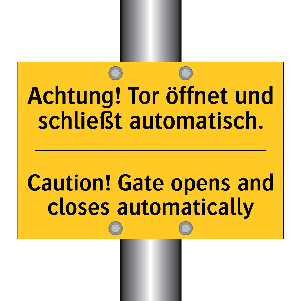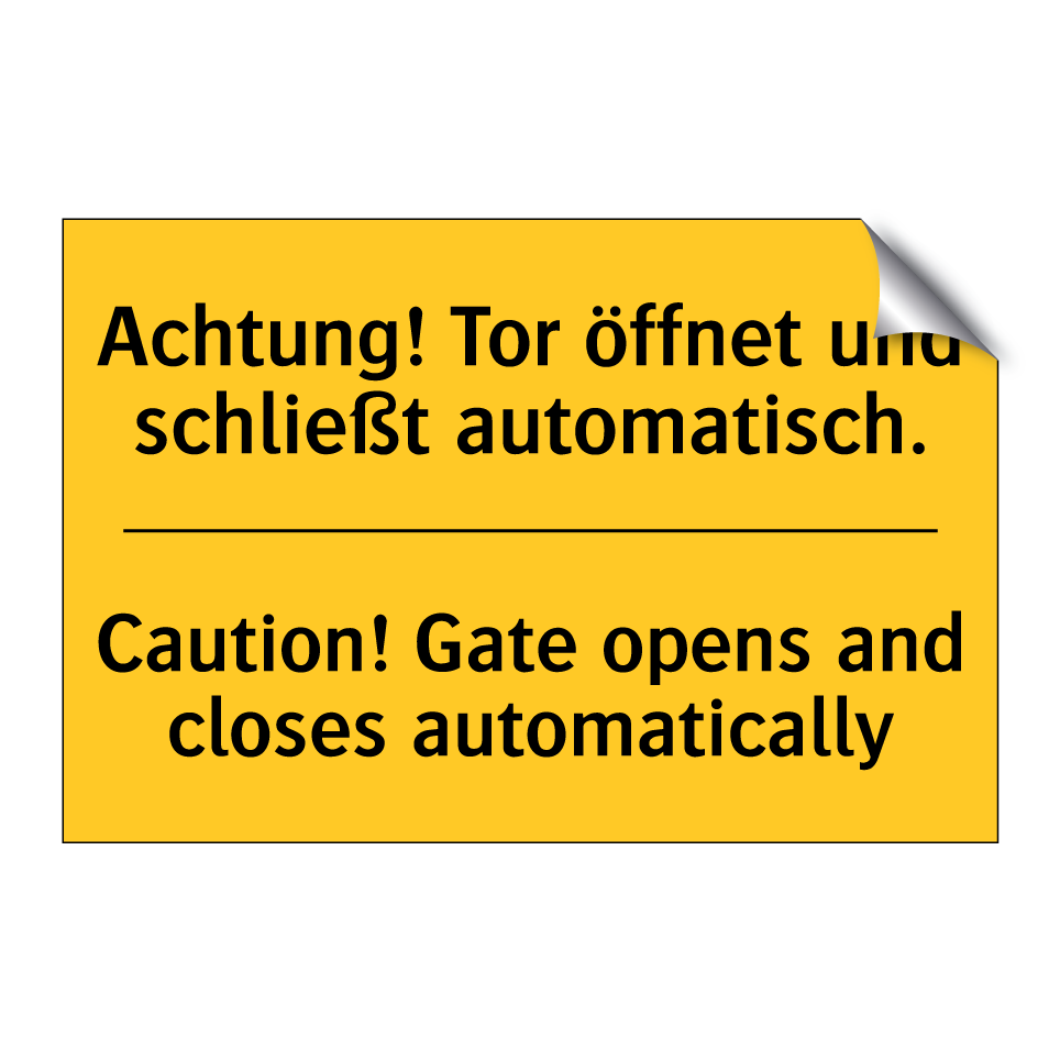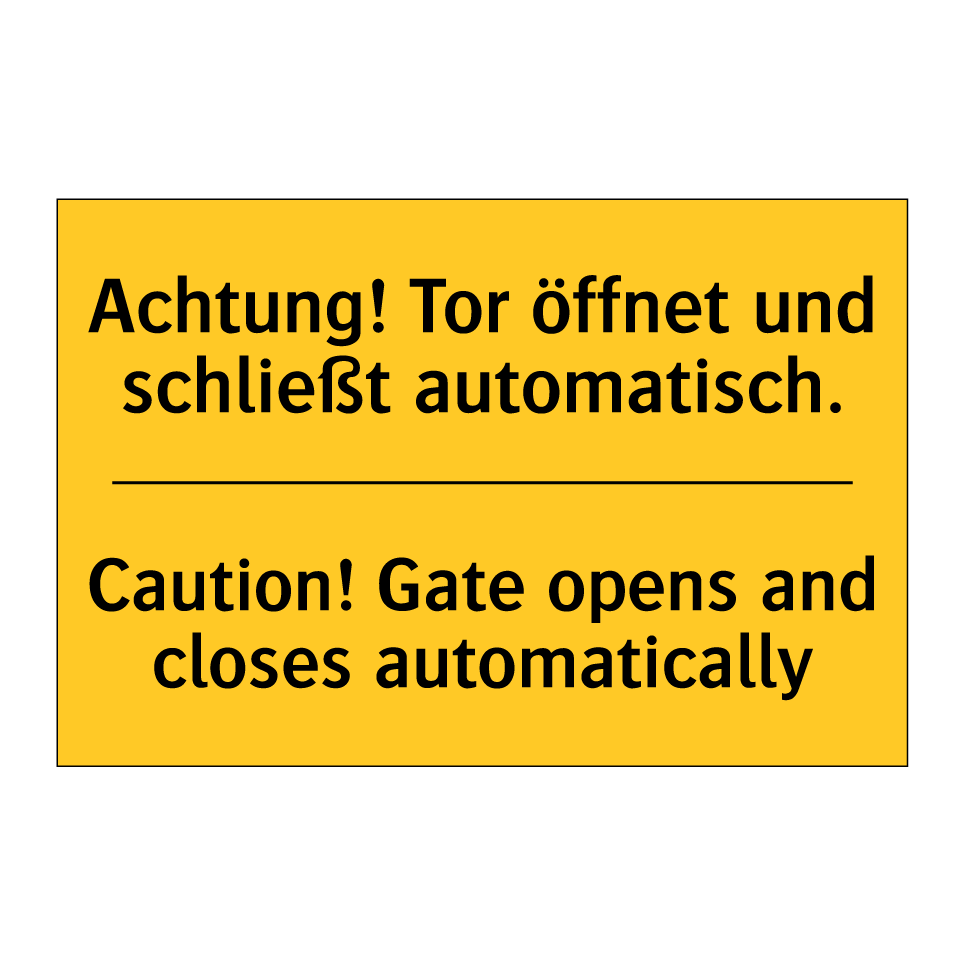 Zweisprachiges Warnschild mit deutschem Text Achtung! Tor öffnet und schließt automatisch. und englischem Text Caution! Gate opens and closes automatically