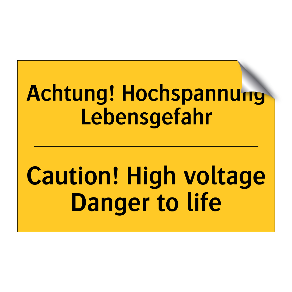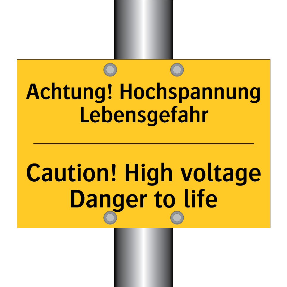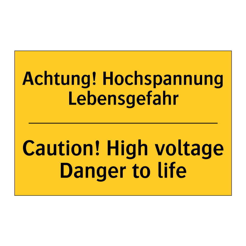 Zweisprachiges Warnschild mit deutschem Text Achtung! Hochspannung Lebensgefahr und englischem Text Caution! High voltage Danger to life