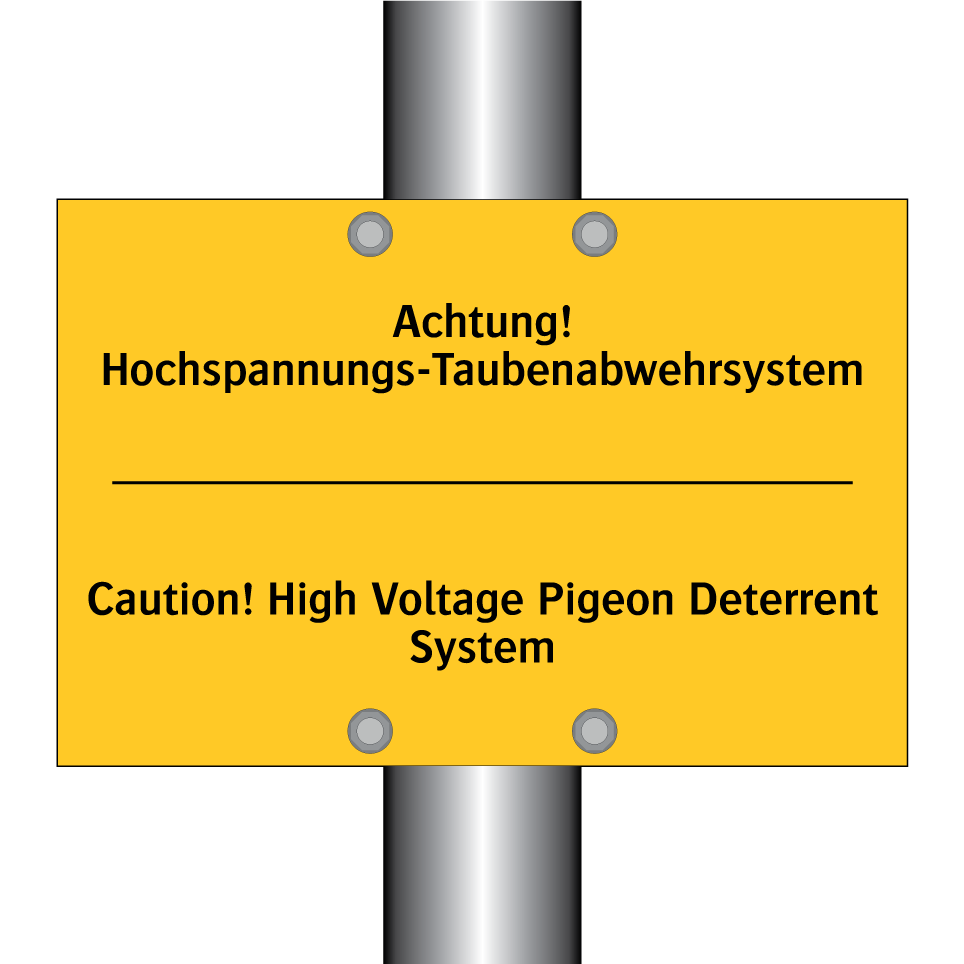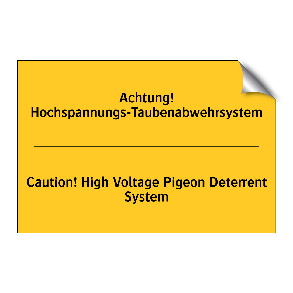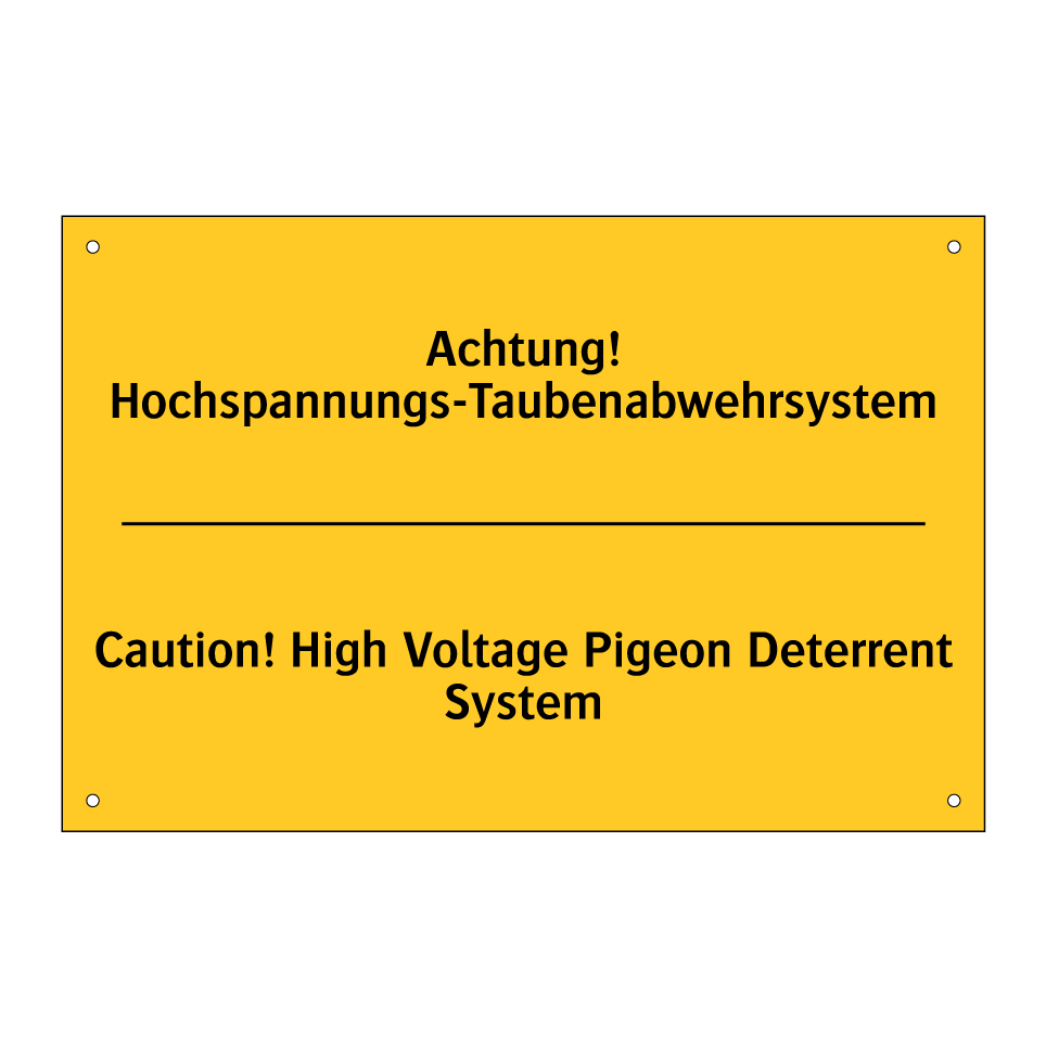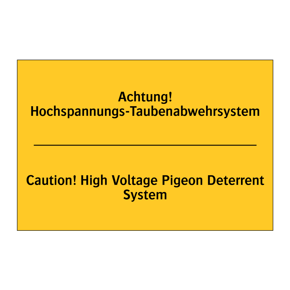 Zweisprachiges Warnschild mit deutschem Text Achtung! Hochspannungs-Taubenabwehrsystem und englischem Text Caution! High Voltage Pigeon Deterrent System