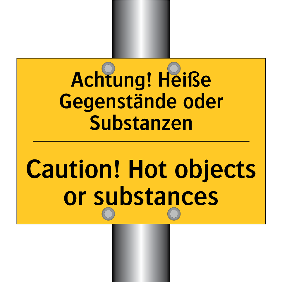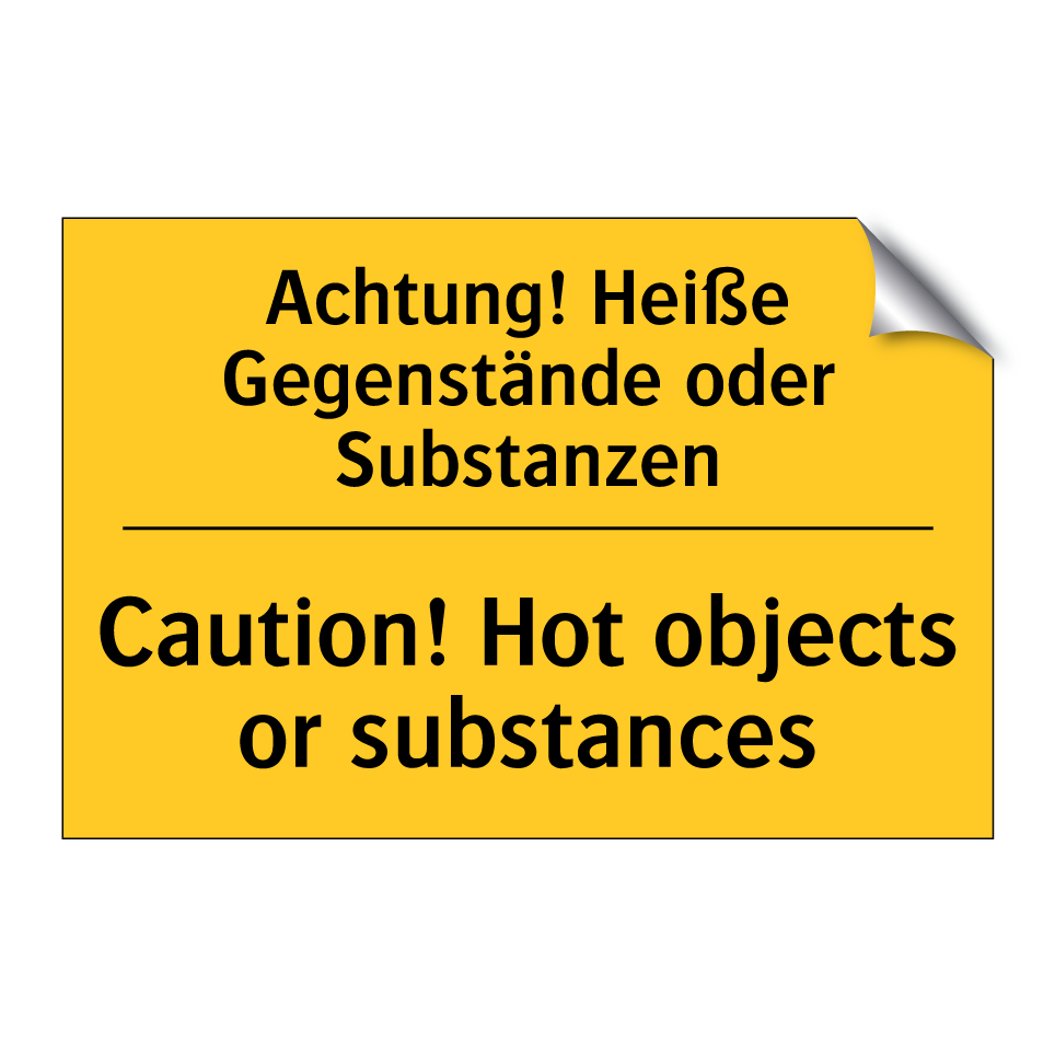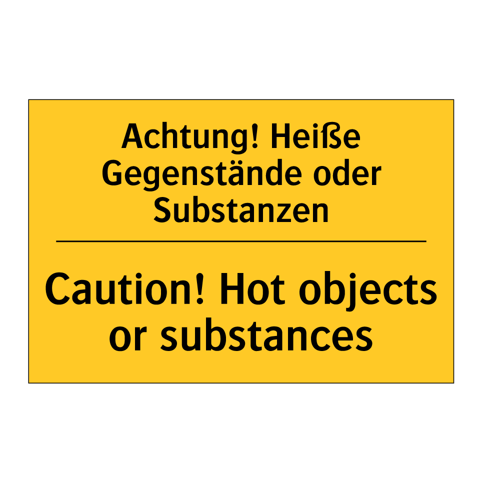 Zweisprachiges Warnschild mit deutschem Text Achtung! Heiße Gegenstände oder Substanzen und englischem Text Caution! Hot objects or substances