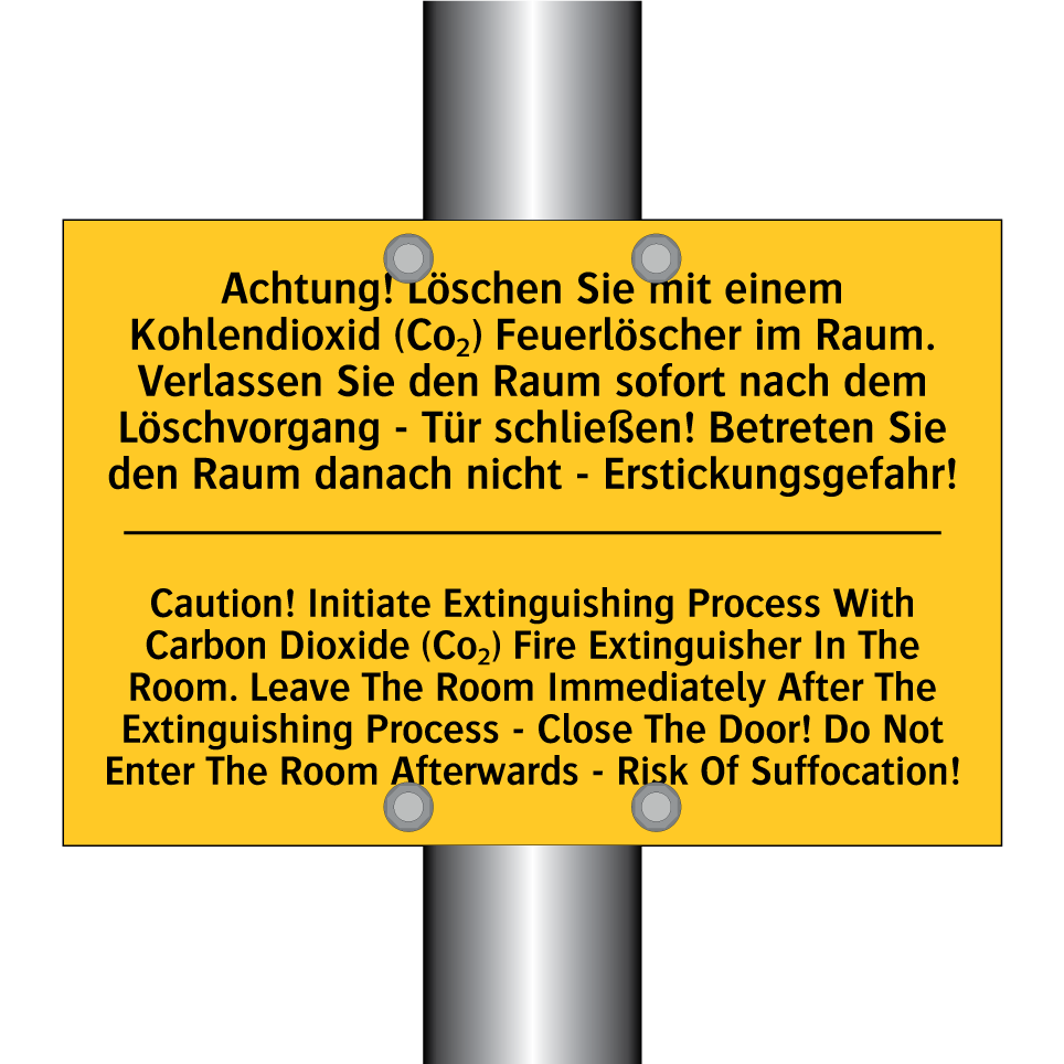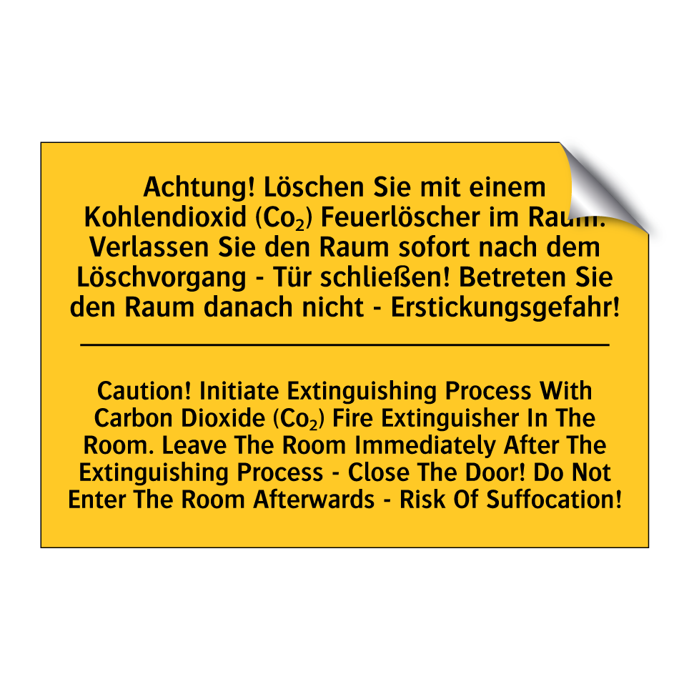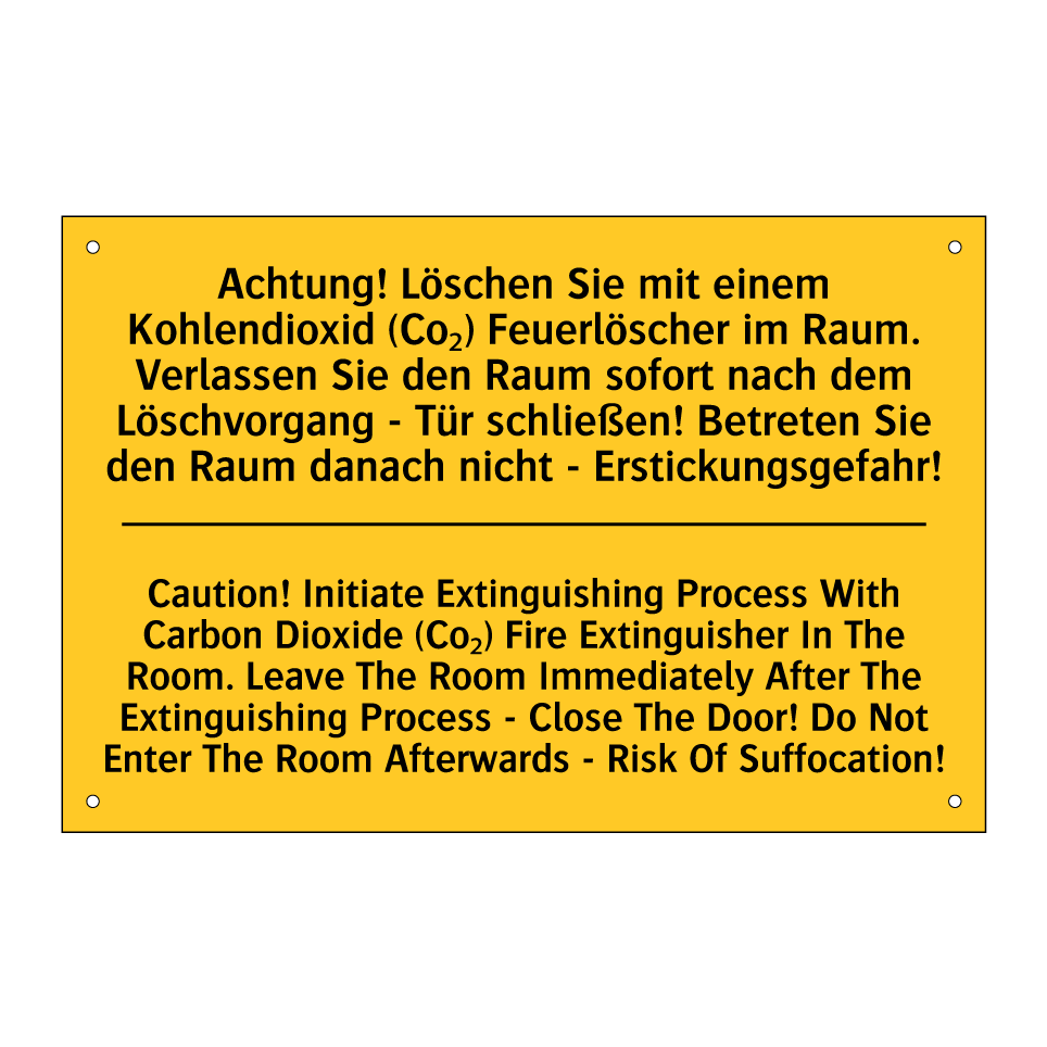 Zweisprachiges Warnschild mit deutschem Text Achtung! Löschen Sie mit einem Kohlendioxid (Co₂) Feuerlöscher im Raum. Verlassen Sie den Raum sofort nach dem Löschvorgang - Tür schließen! Betreten Sie den Raum danach nicht - Erstickungsgefahr! und englischem Text Caution! Initiate Extinguishing Process With Carbon Dioxide (Co₂) Fire Extinguisher In The Room. Leave The Room Immediately After The Extinguishing Process - Close The Door! Do Not Enter The Room Afterwards - Risk Of Suffocation!