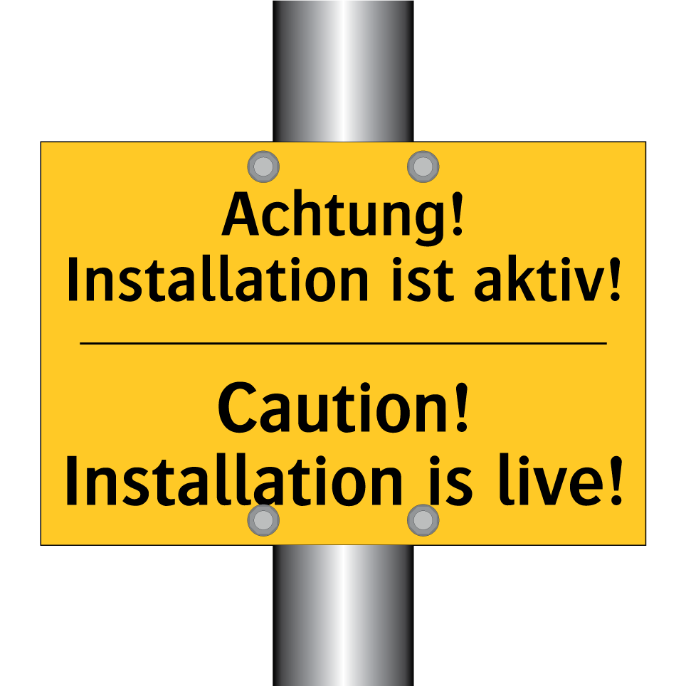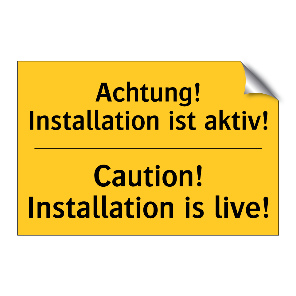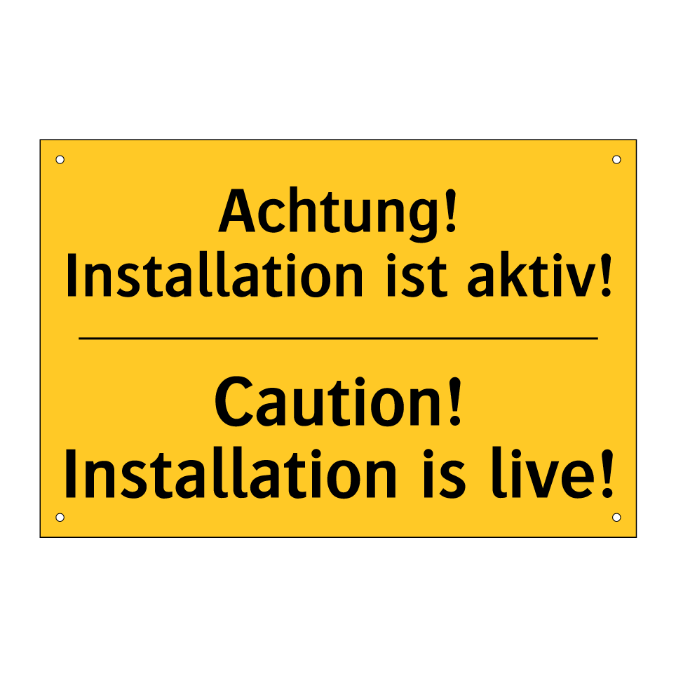 Zweisprachiges Warnschild mit deutschem Text Achtung! Installation ist aktiv! und englischem Text Caution! Installation is live!