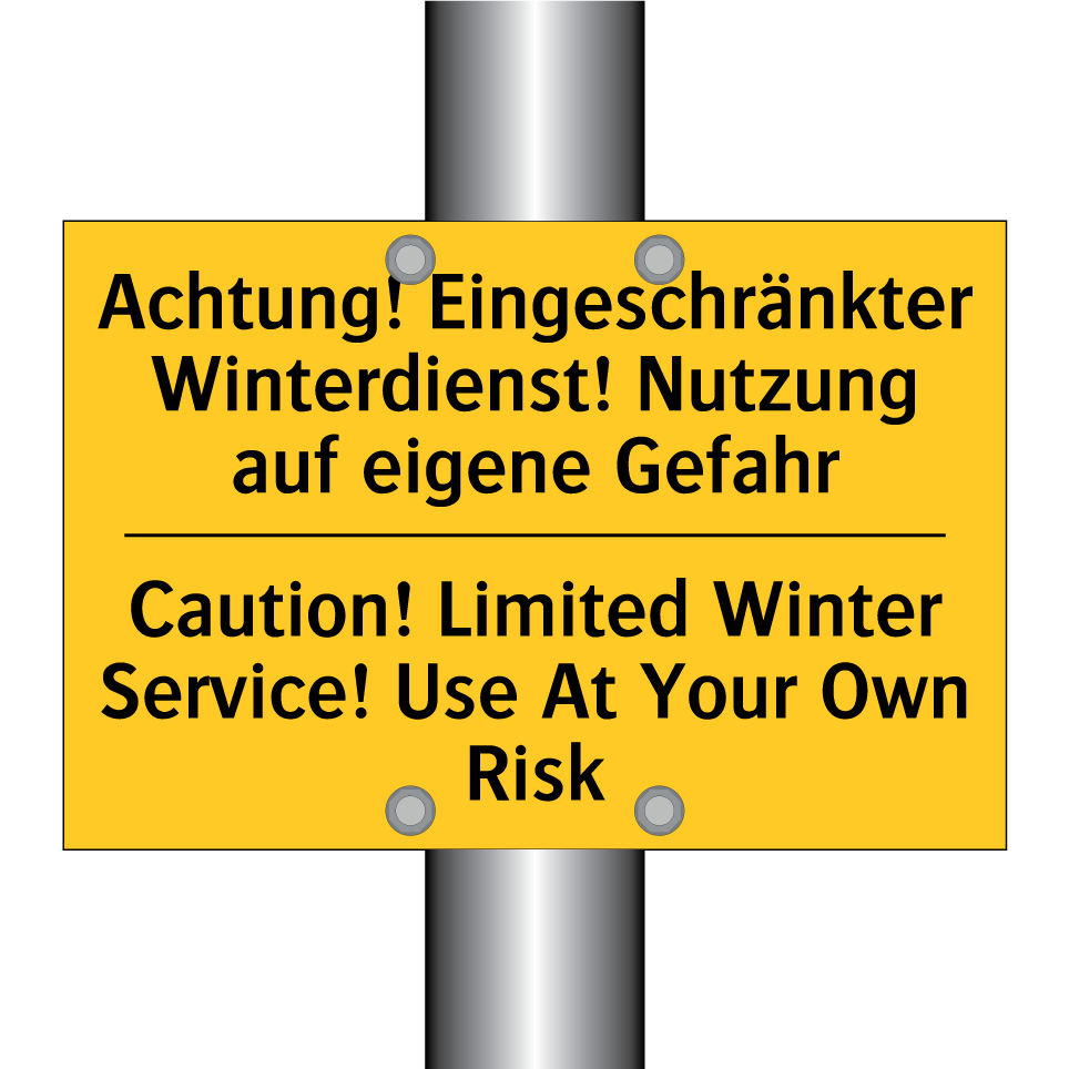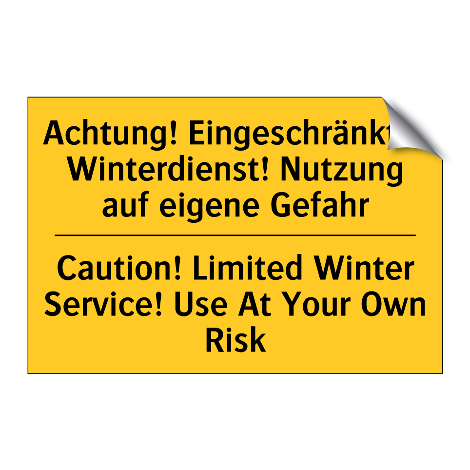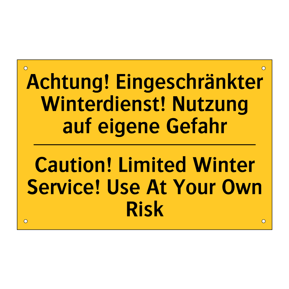 Zweisprachiges Warnschild mit deutschem Text Achtung! Eingeschränkter Winterdienst! Nutzung auf eigene Gefahr und englischem Text Caution! Limited Winter Service! Use At Your Own Risk
