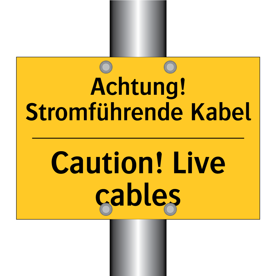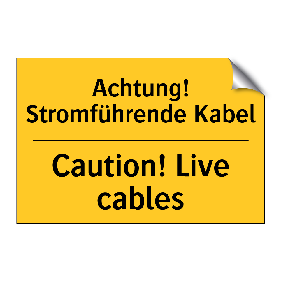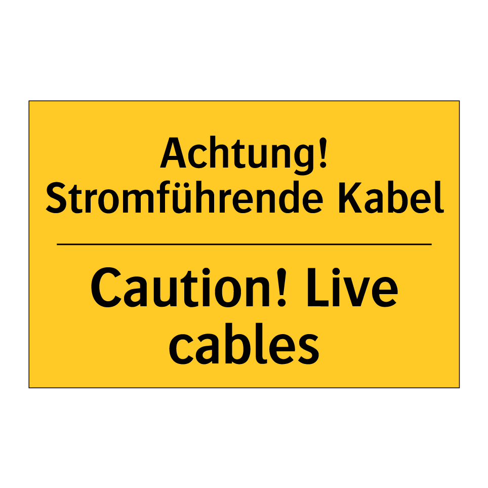 Zweisprachiges Warnschild mit deutschem Text Achtung! Stromführende Kabel und englischem Text Caution! Live cables