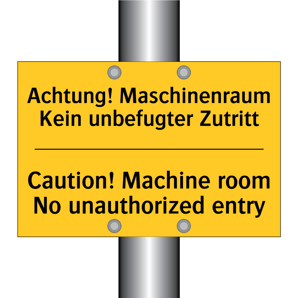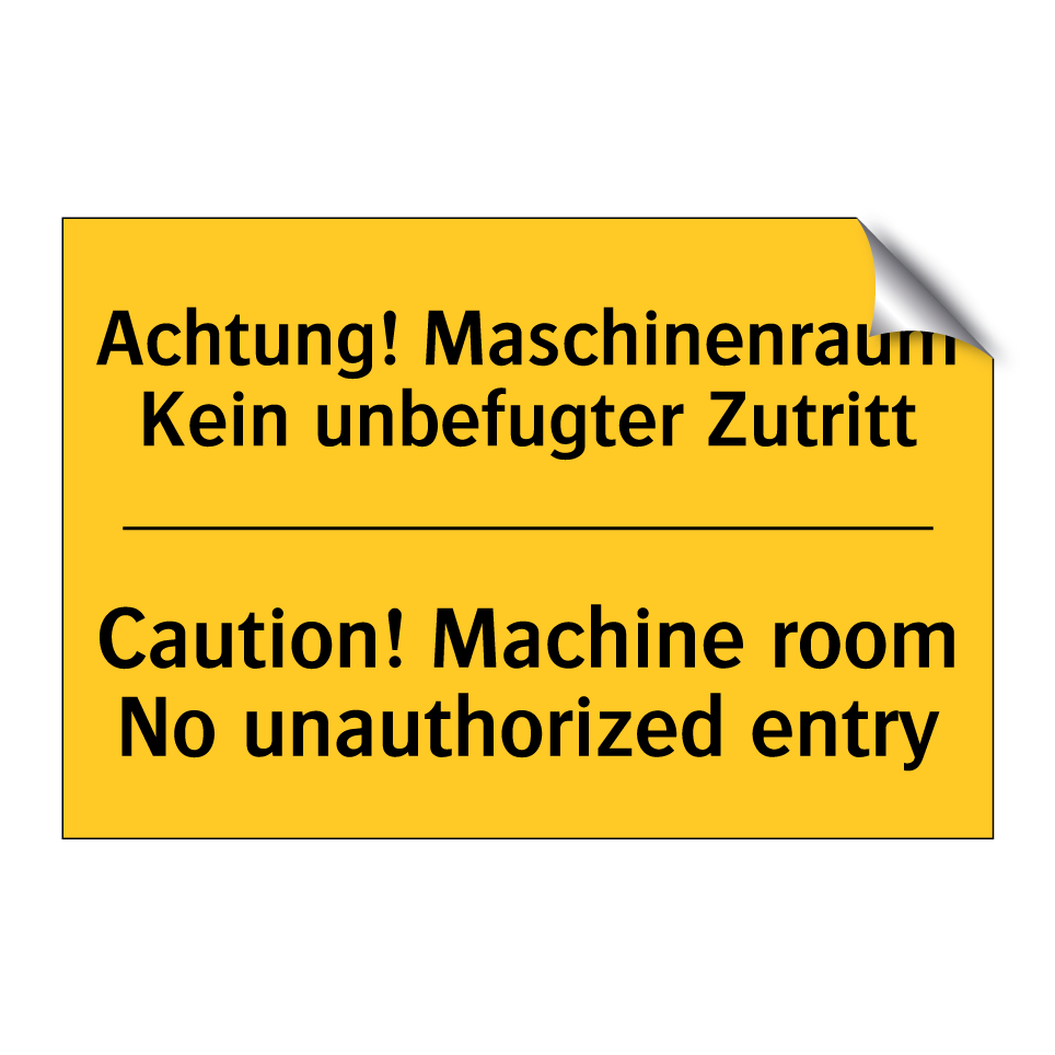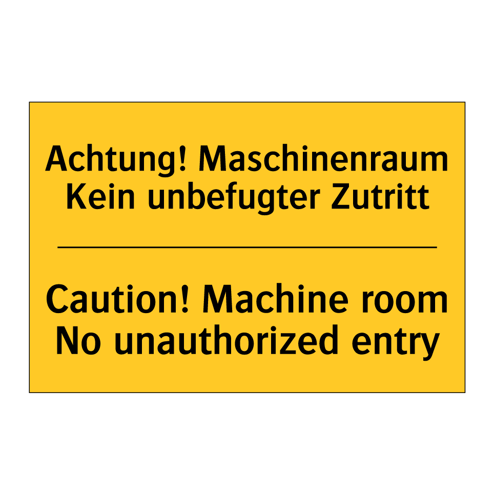 Zweisprachiges Warnschild mit deutschem Text Achtung! Maschinenraum Kein unbefugter Zutritt und englischem Text Caution! Machine room No unauthorized entry