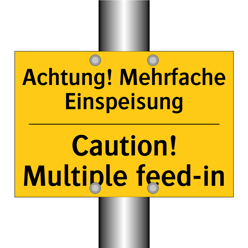 Zweisprachiges Warnschild mit deutschem Text Achtung! Mehrfache Einspeisung und englischem Text Caution! Multiple feed-in
