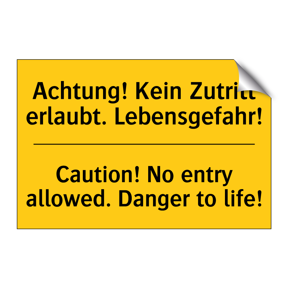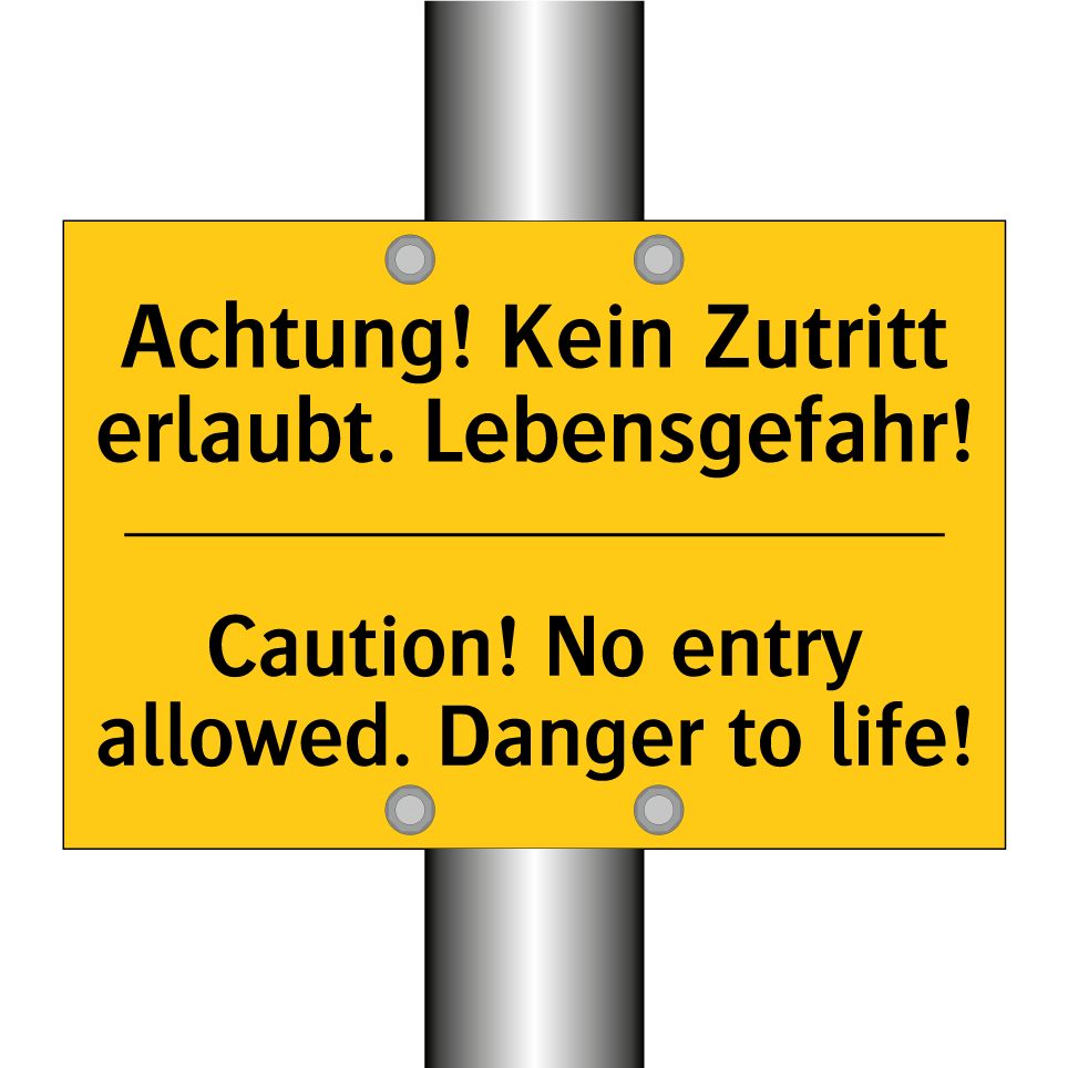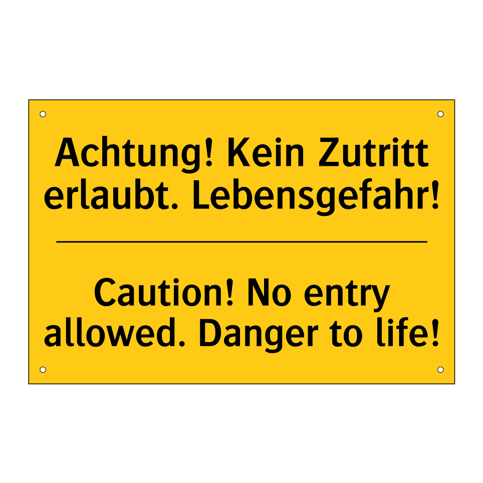 Zweisprachiges Warnschild mit deutschem Text Achtung! Kein Zutritt erlaubt. Lebensgefahr! und englischem Text Caution! No entry allowed. Danger to life!