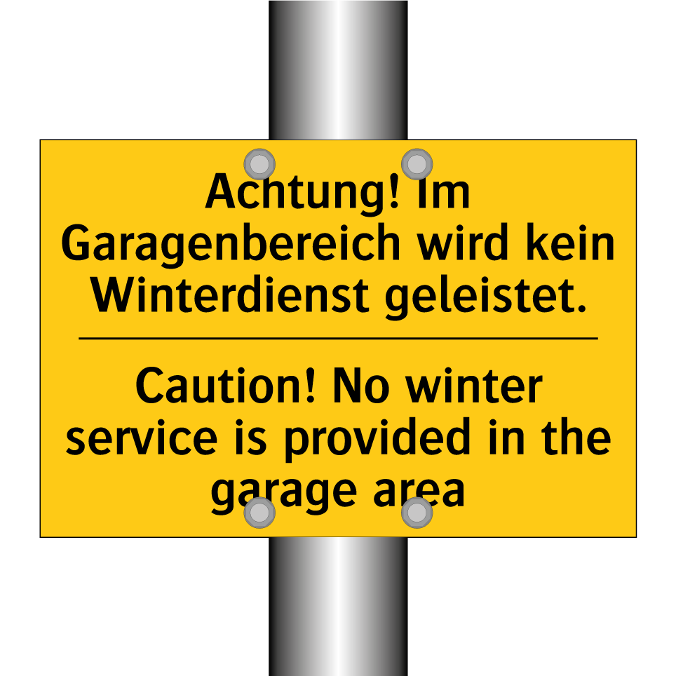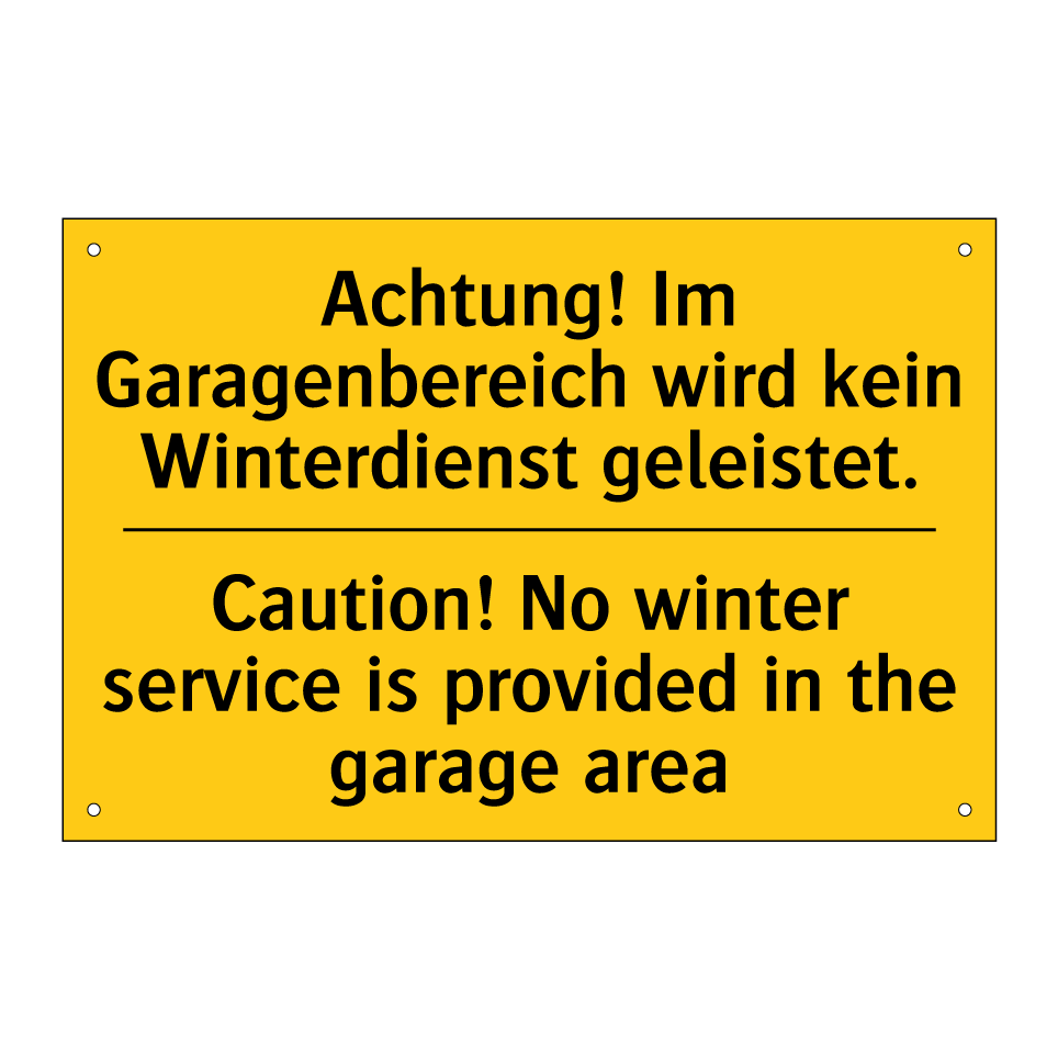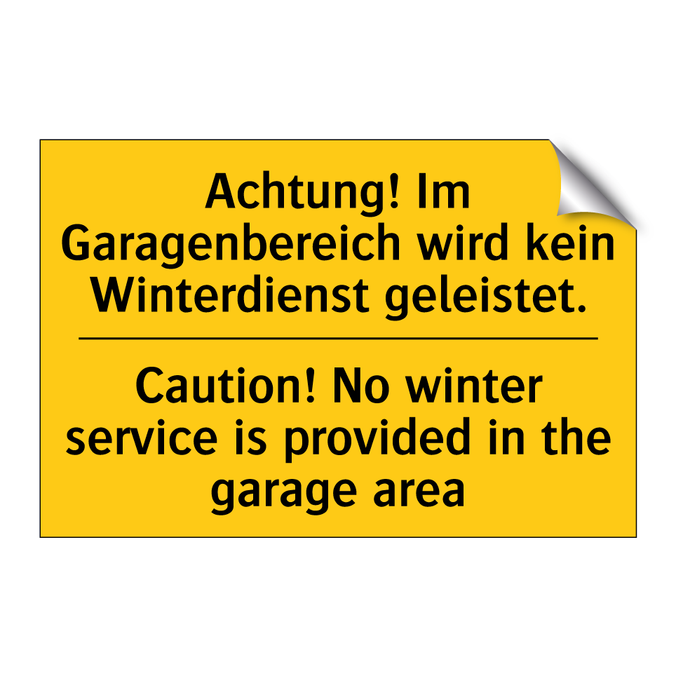 Zweisprachiges Warnschild mit deutschem Text Achtung! Im Garagenbereich wird kein Winterdienst geleistet. und englischem Text Caution! No winter service is provided in the garage area