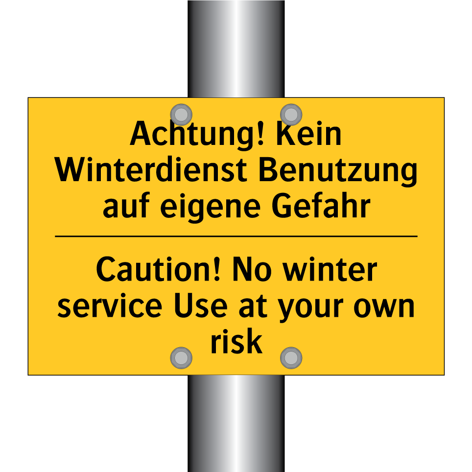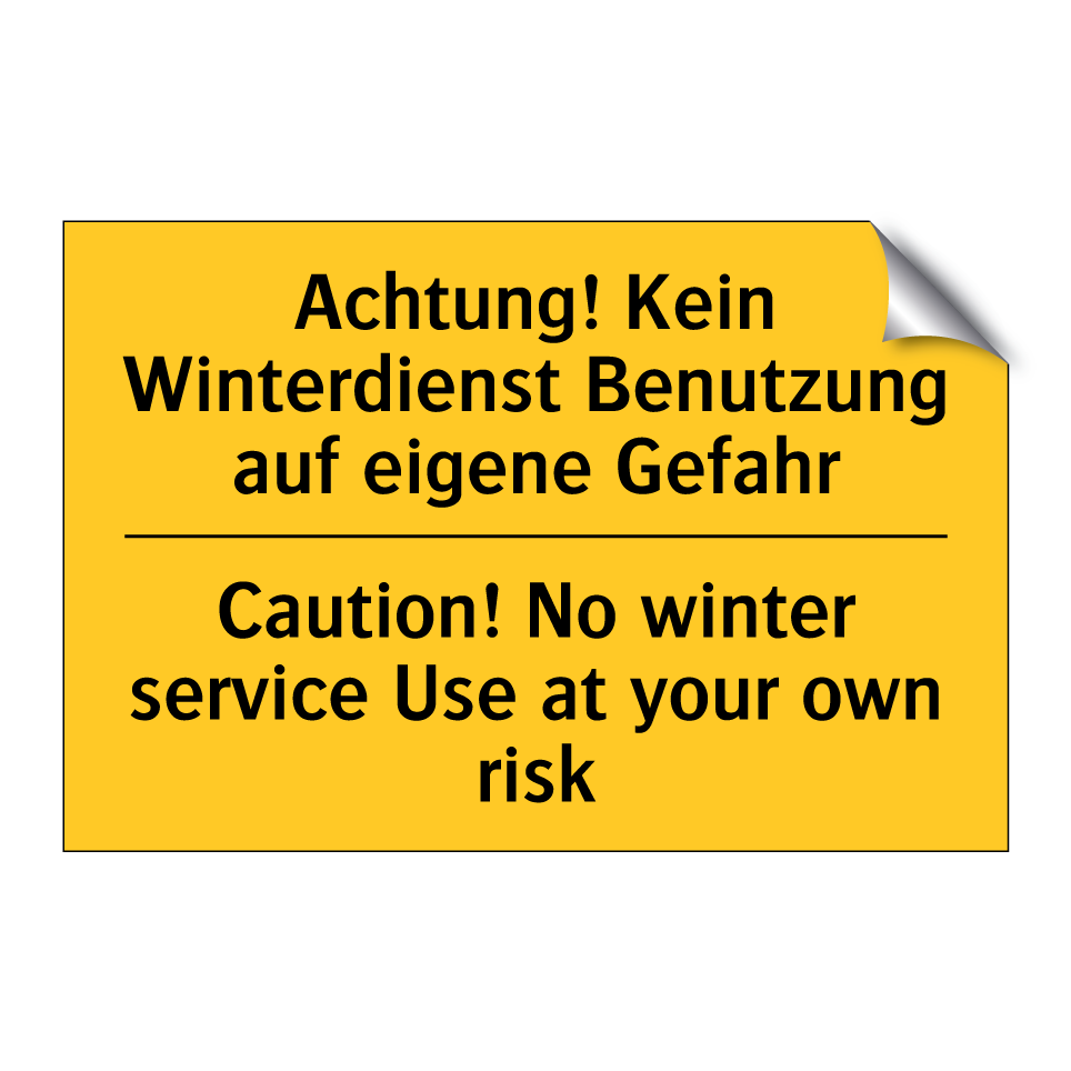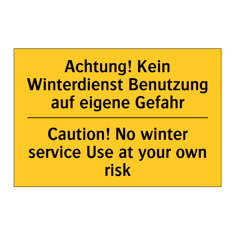 Zweisprachiges Warnschild mit deutschem Text Achtung! Kein Winterdienst Benutzung auf eigene Gefahr und englischem Text Caution! No winter service Use at your own risk
