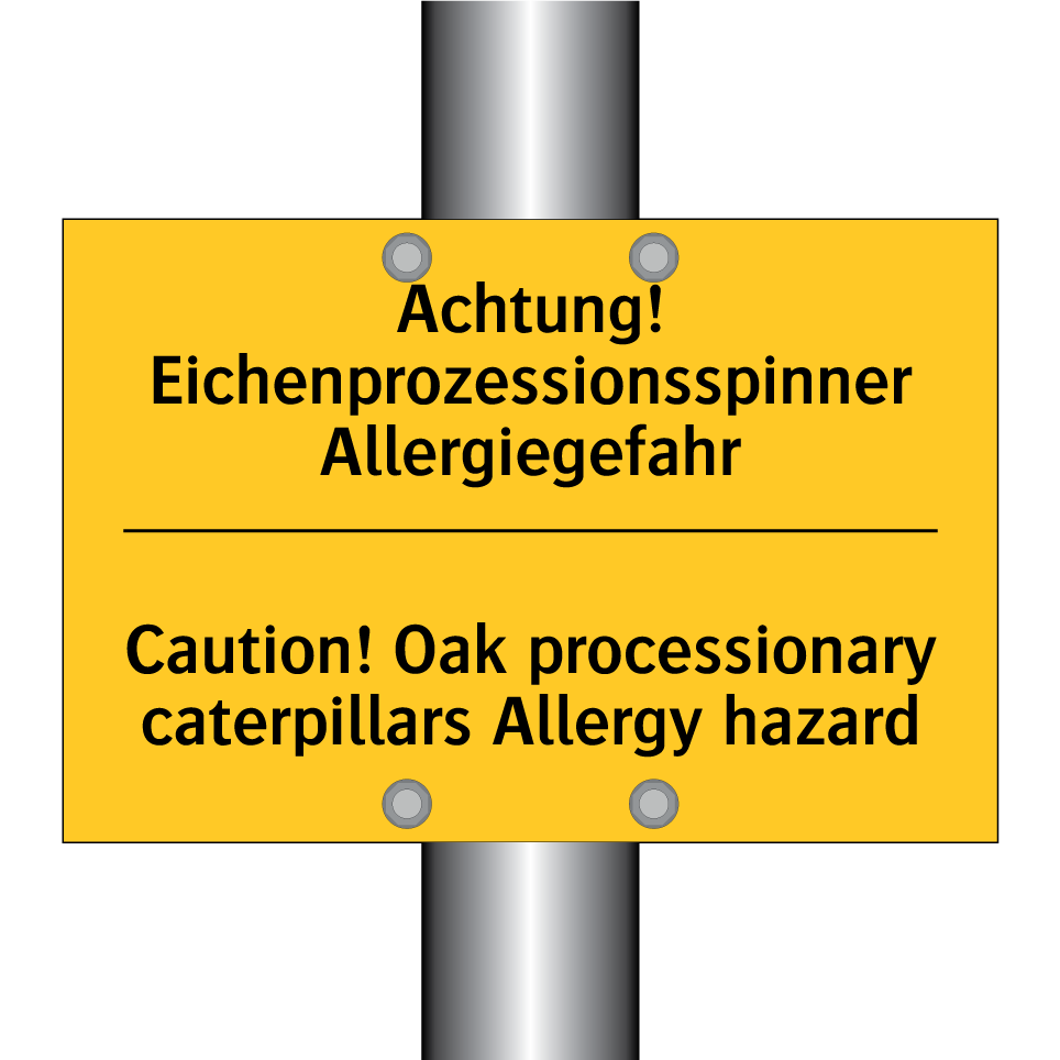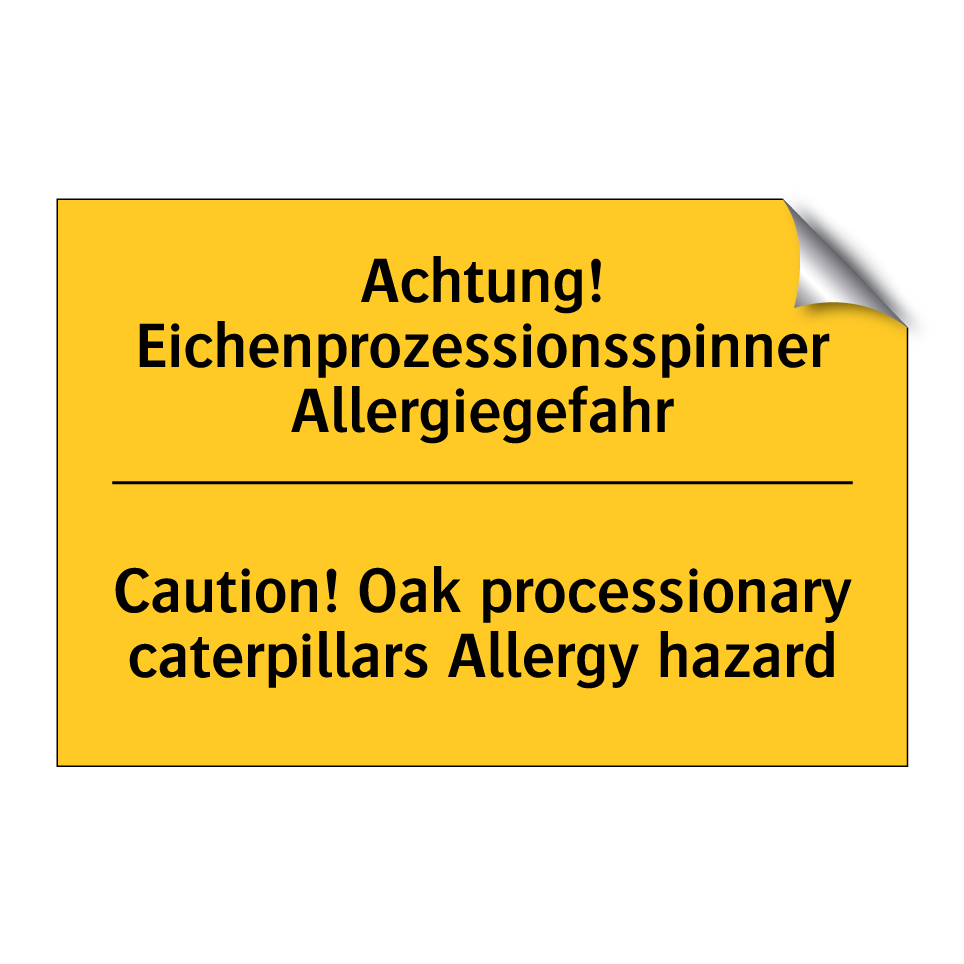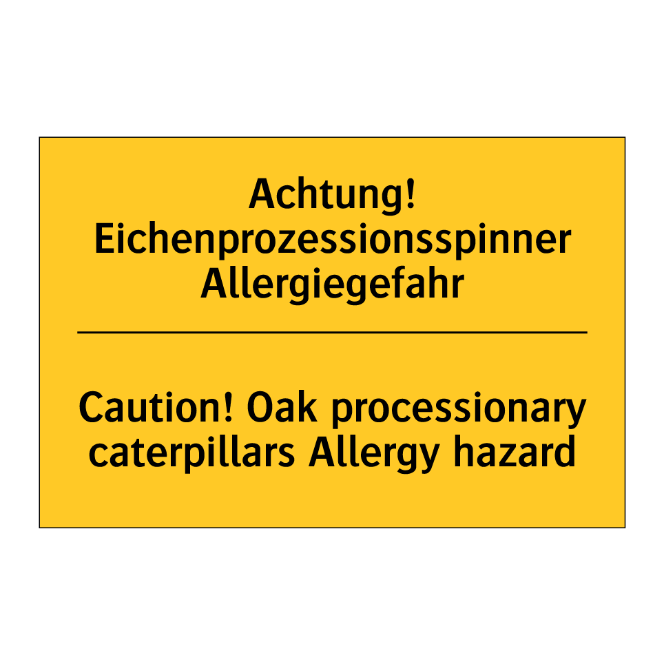 Zweisprachiges Warnschild mit deutschem Text Achtung! Eichenprozessionsspinner Allergiegefahr und englischem Text Caution! Oak processionary caterpillars Allergy hazard
