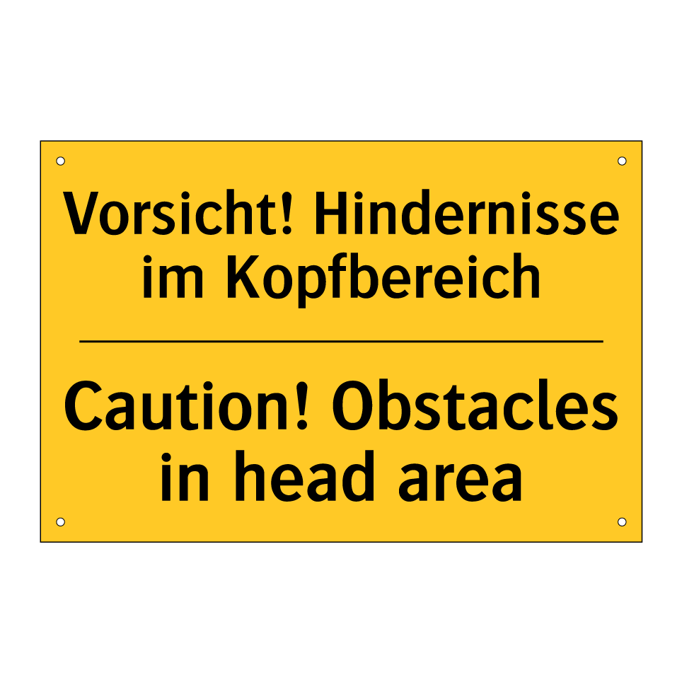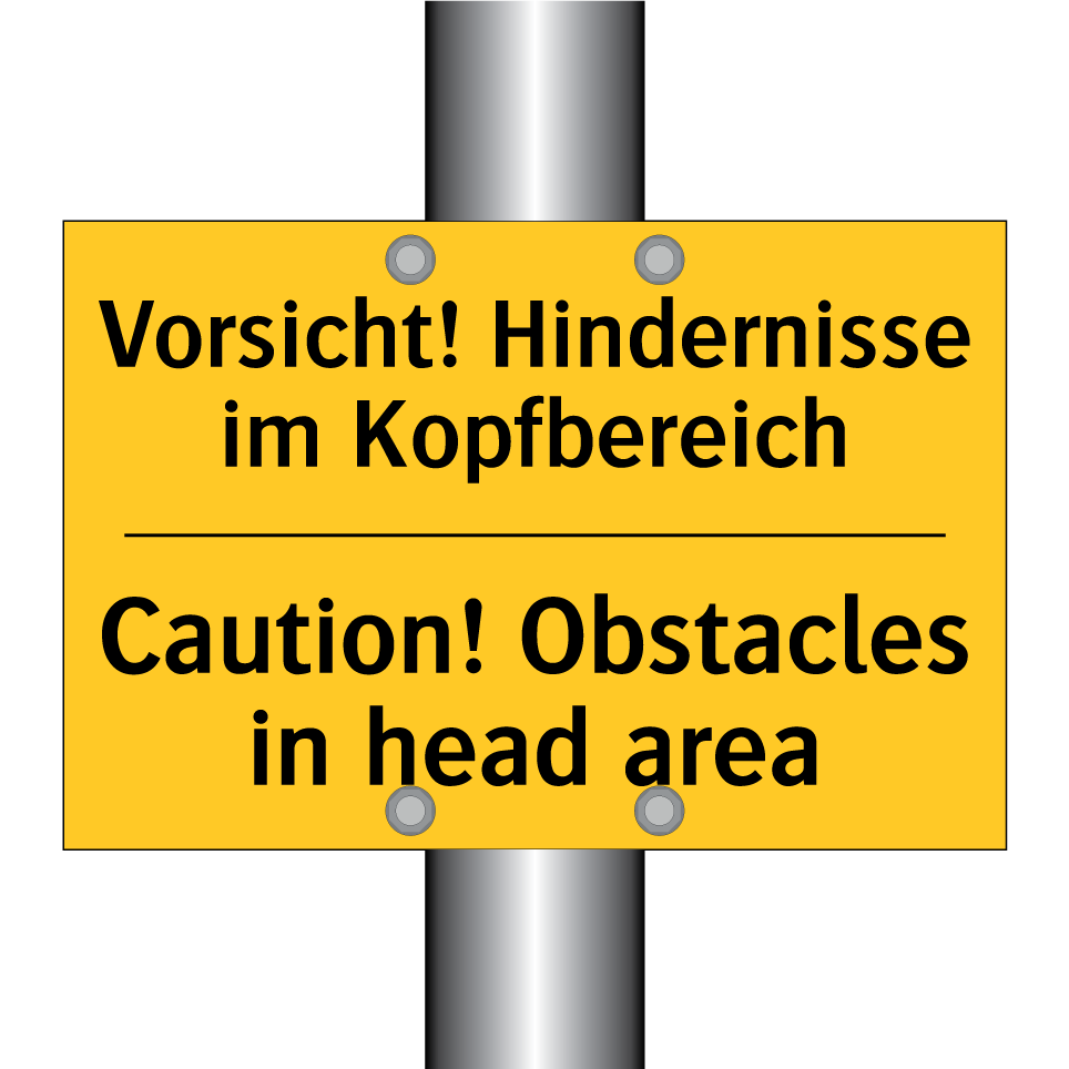 Zweisprachiges Warnschild mit deutschem Text Vorsicht! Hindernisse im Kopfbereich und englischem Text Caution! Obstacles in head area
