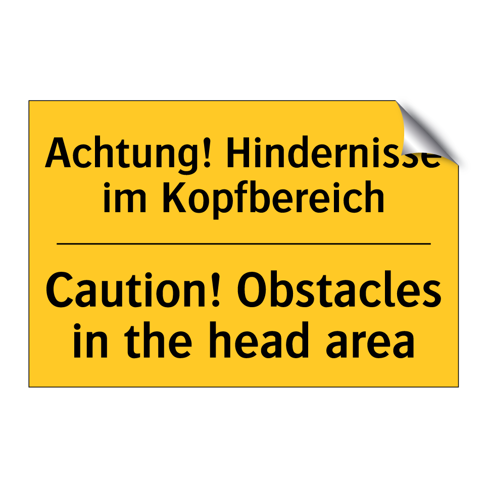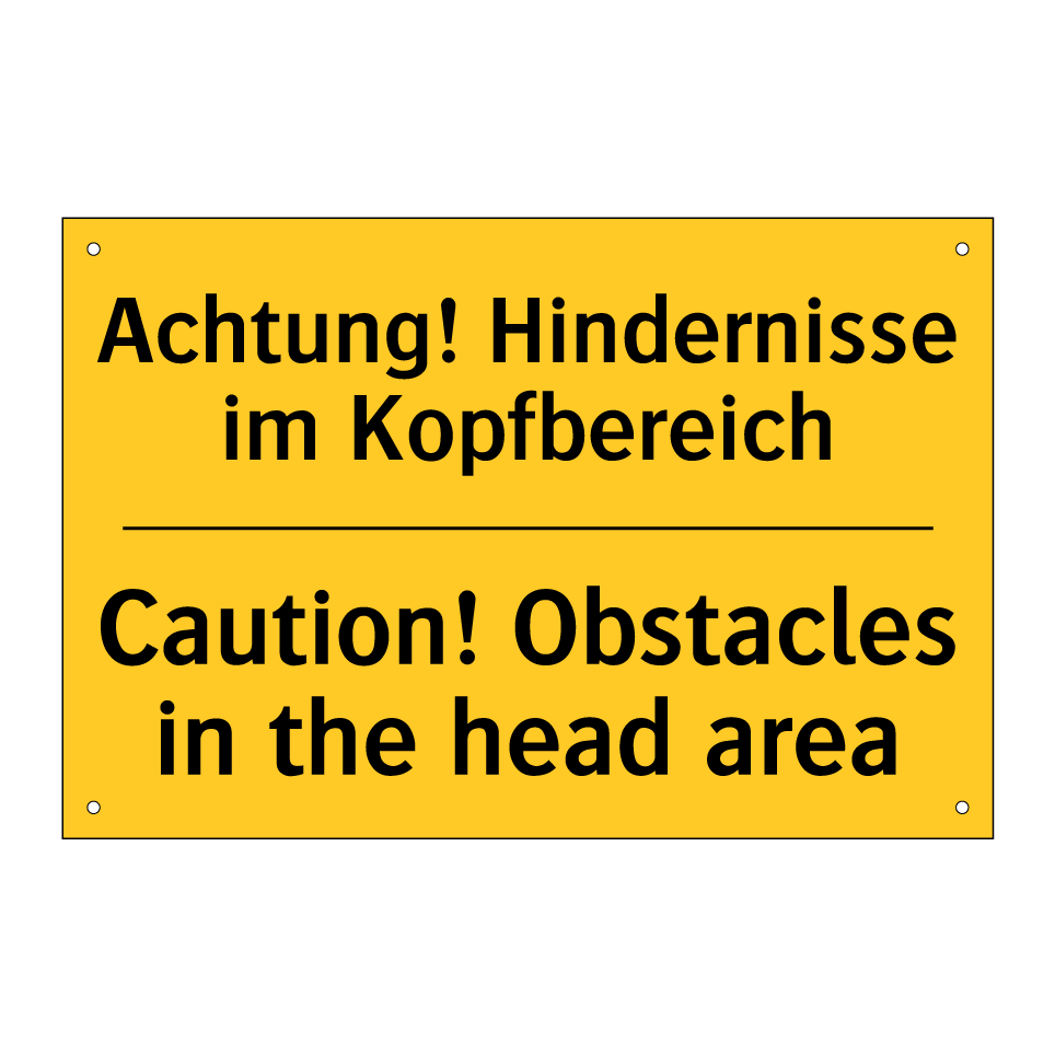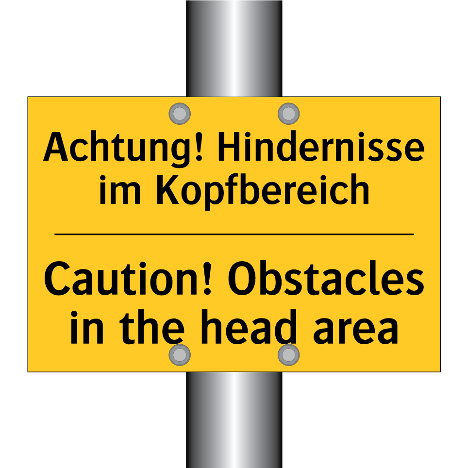 Zweisprachiges Warnschild mit deutschem Text Achtung! Hindernisse im Kopfbereich und englischem Text Caution! Obstacles in the head area