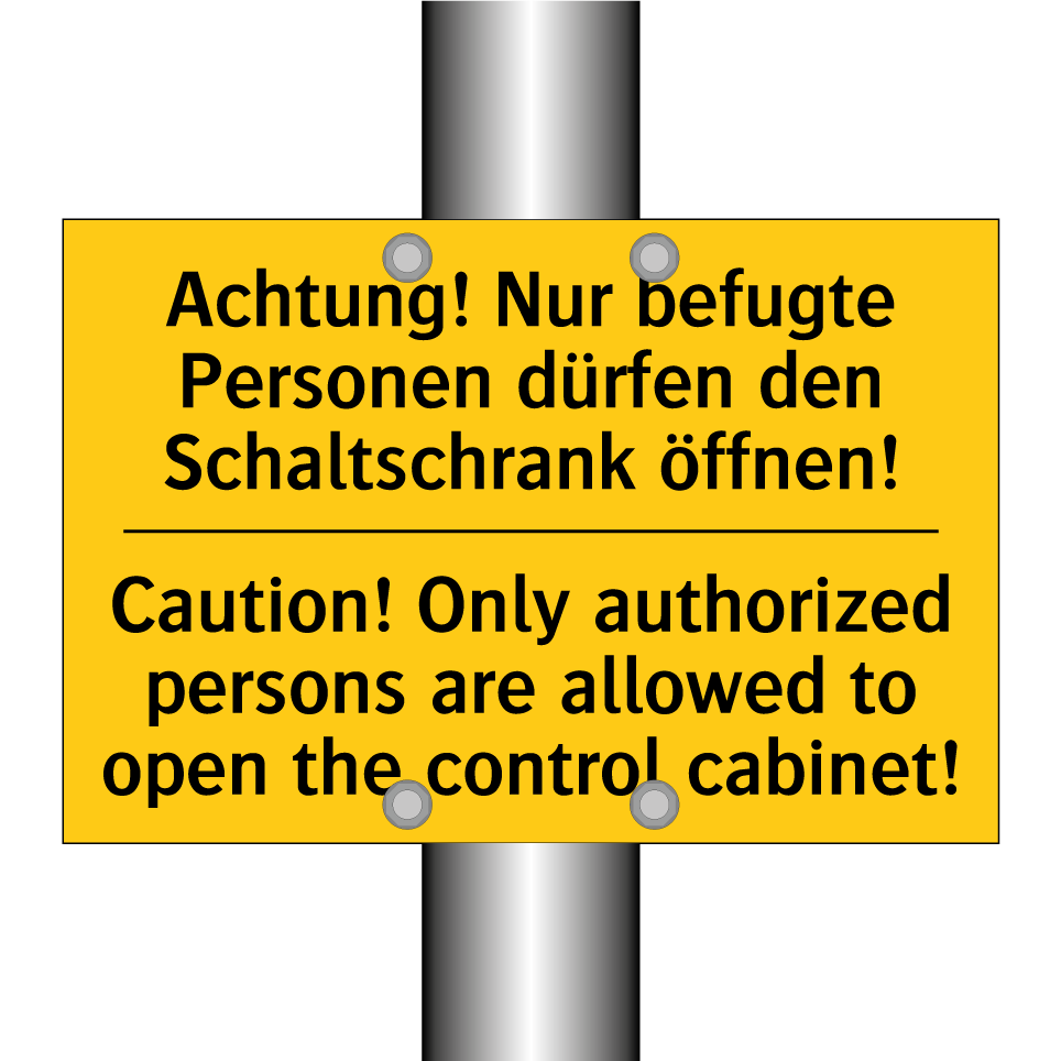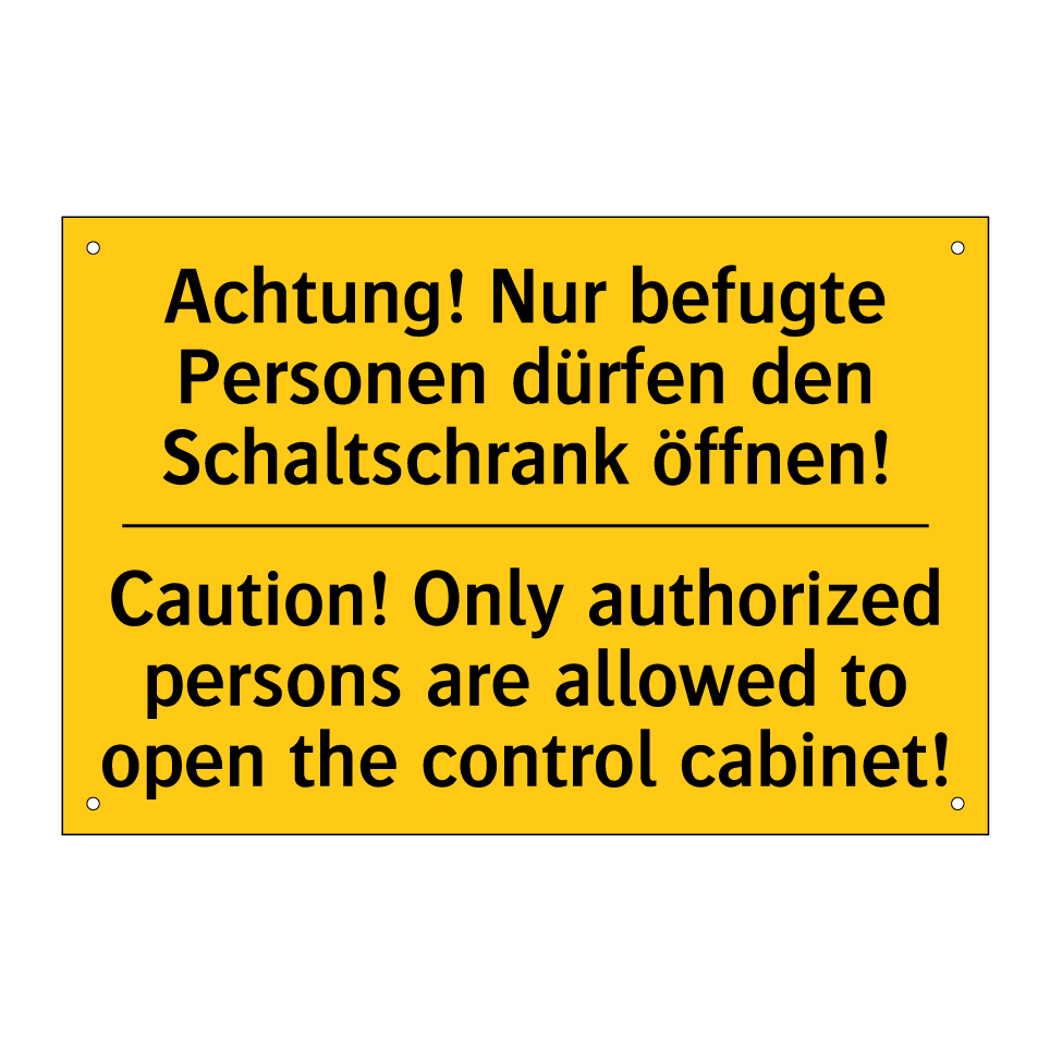 Zweisprachiges Warnschild mit deutschem Text Achtung! Nur befugte Personen dürfen den Schaltschrank öffnen! und englischem Text Caution! Only authorized persons are allowed to open the control cabinet!