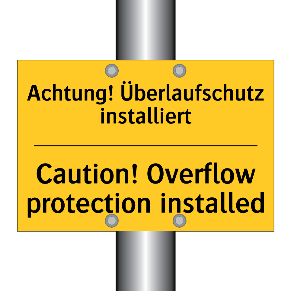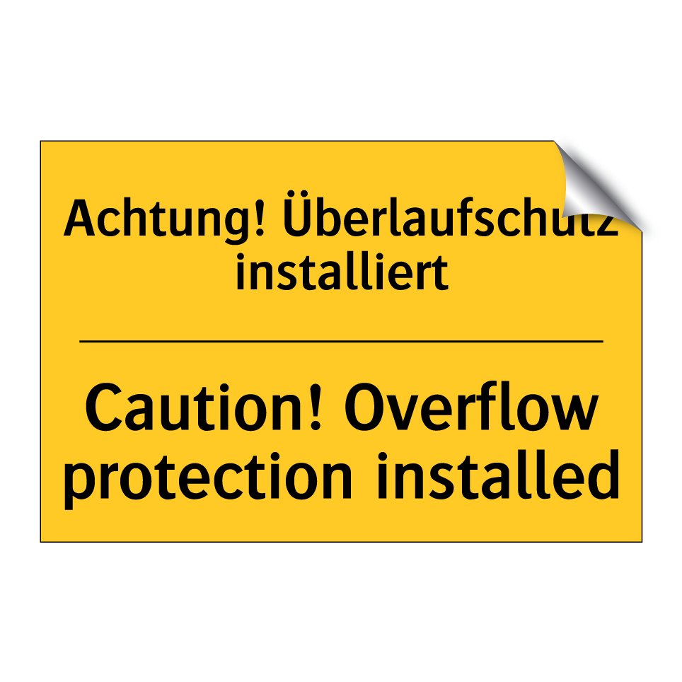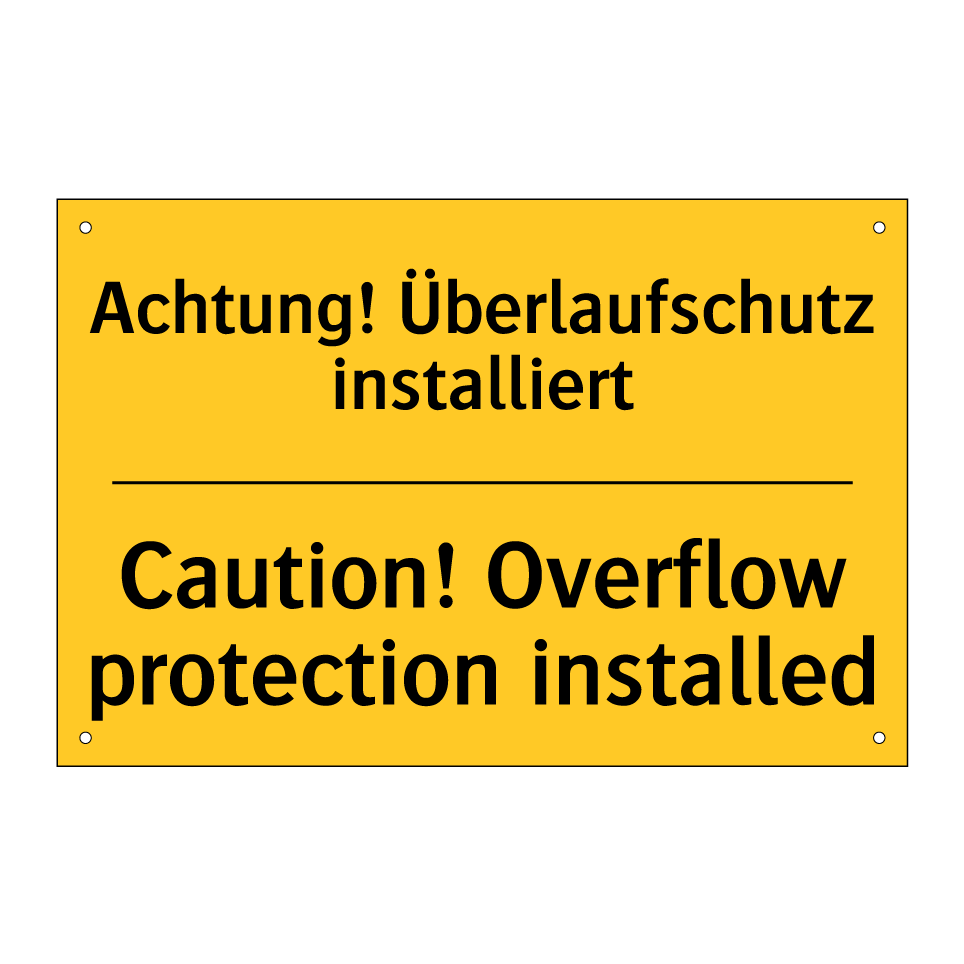 Zweisprachiges Warnschild mit deutschem Text Achtung! Überlaufschutz installiert und englischem Text Caution! Overflow protection installed