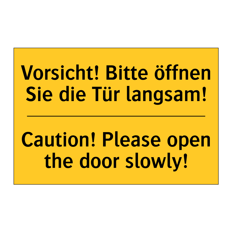 Zweisprachiges Warnschild mit deutschem Text Vorsicht! Bitte öffnen Sie die Tür langsam! und englischem Text Caution! Please open the door slowly!