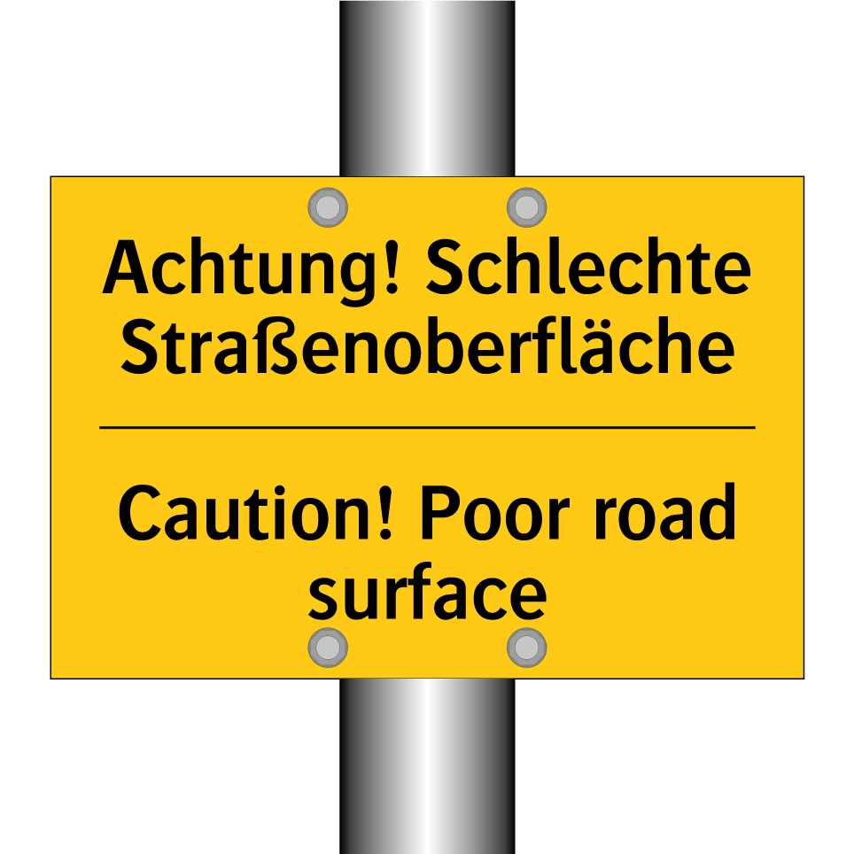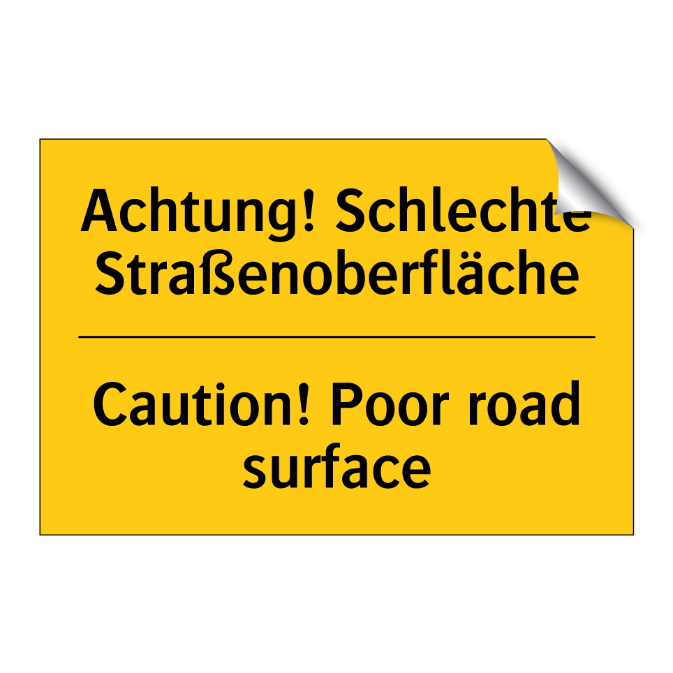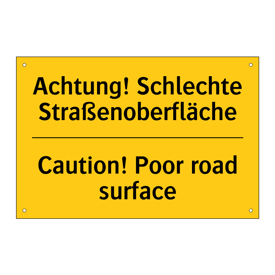 Zweisprachiges Warnschild mit deutschem Text Achtung! Schlechte Straßenoberfläche und englischem Text Caution! Poor road surface