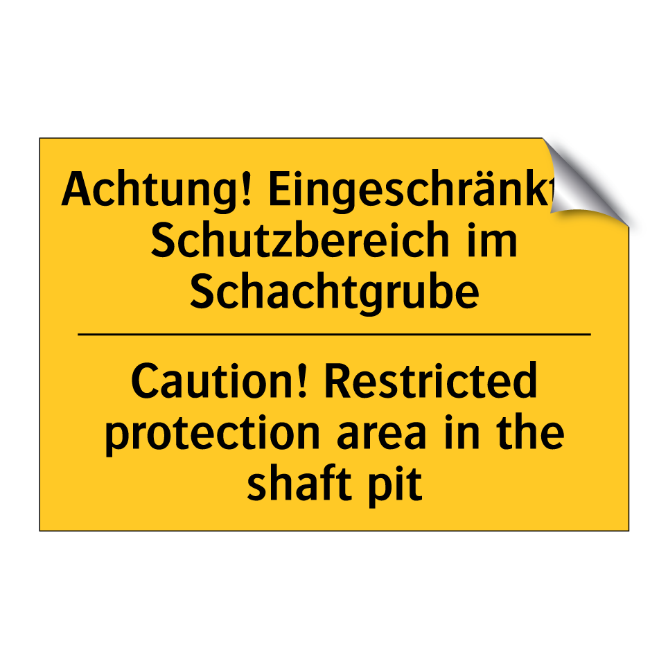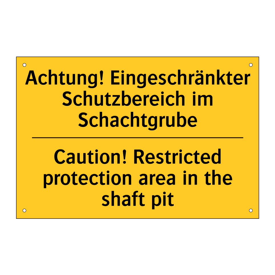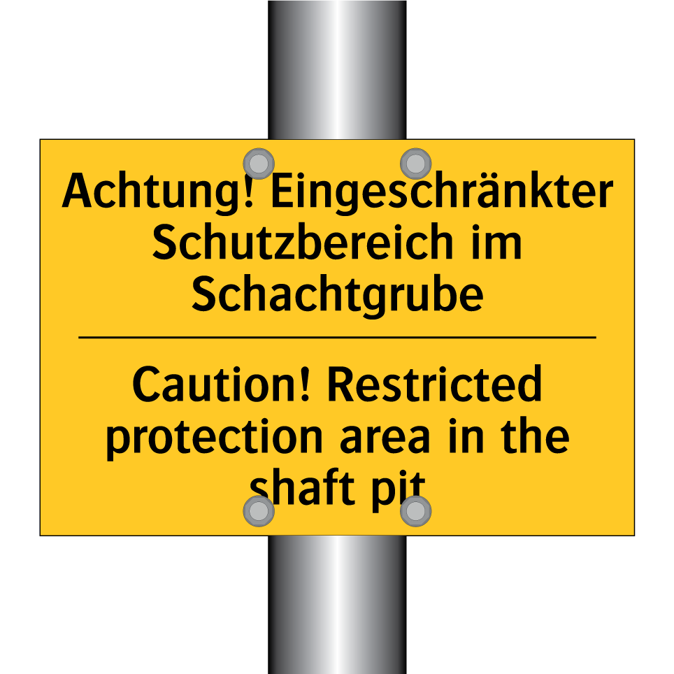 Zweisprachiges Warnschild mit deutschem Text Achtung! Eingeschränkter Schutzbereich im Schachtgrube und englischem Text Caution! Restricted protection area in the shaft pit