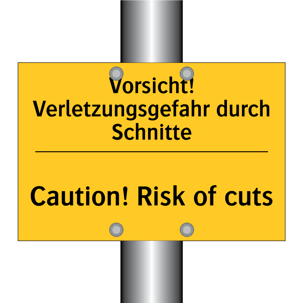 Zweisprachiges Warnschild mit deutschem Text Vorsicht! Verletzungsgefahr durch Schnitte und englischem Text Caution! Risk of cuts