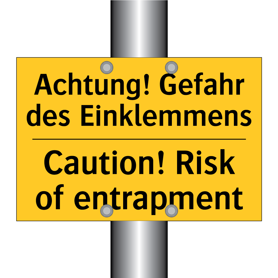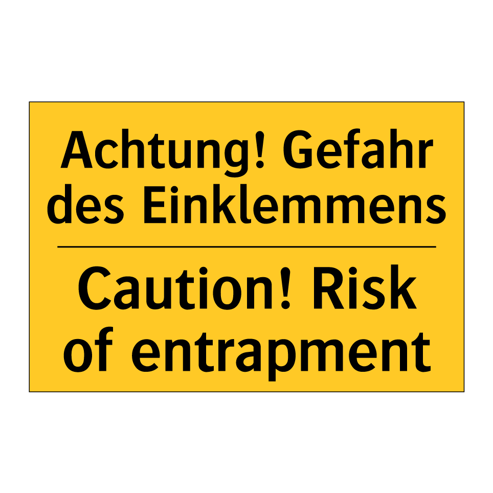 Zweisprachiges Warnschild mit deutschem Text Achtung! Gefahr des Einklemmens und englischem Text Caution! Risk of entrapment