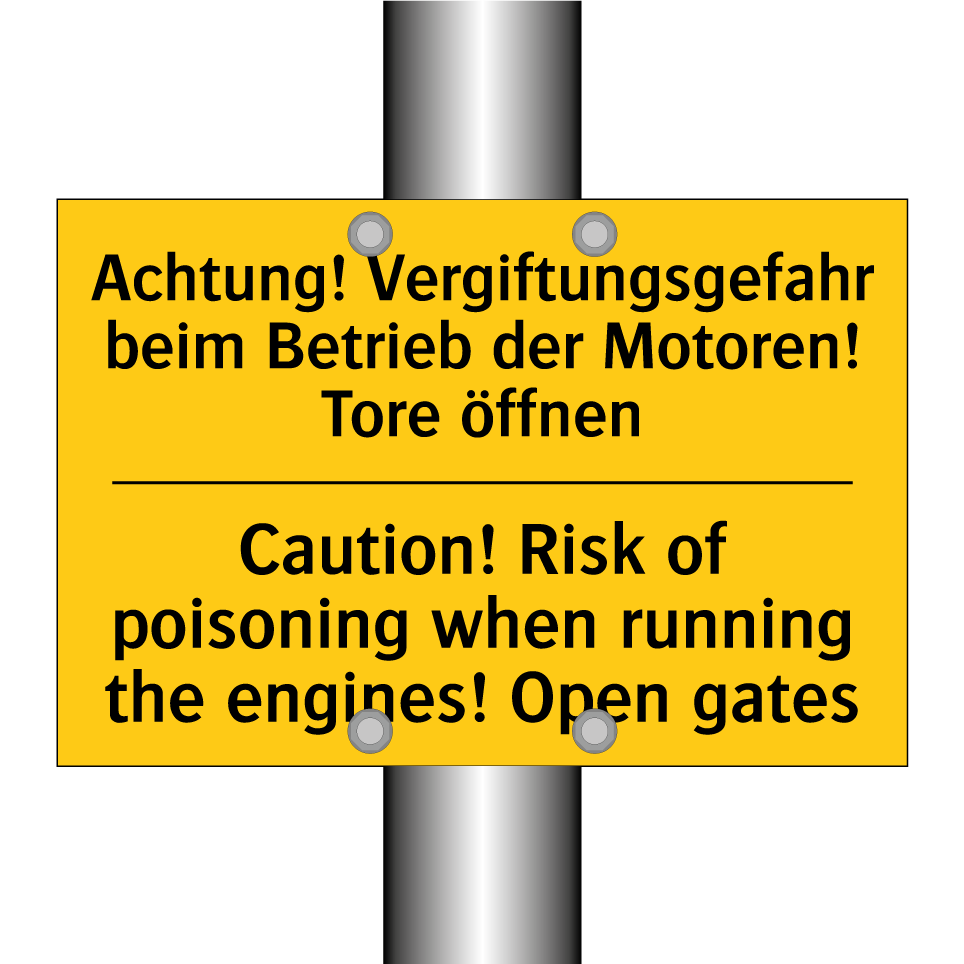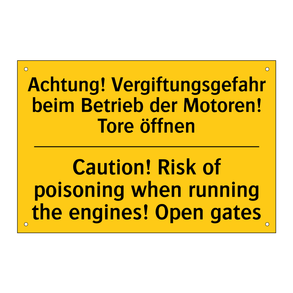Zweisprachiges Warnschild mit deutschem Text Achtung! Vergiftungsgefahr beim Betrieb der Motoren! Tore öffnen und englischem Text Caution! Risk of poisoning when running the engines! Open gates