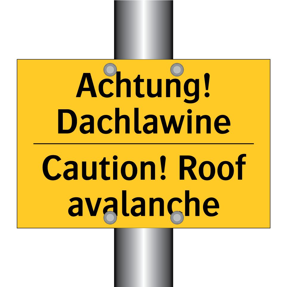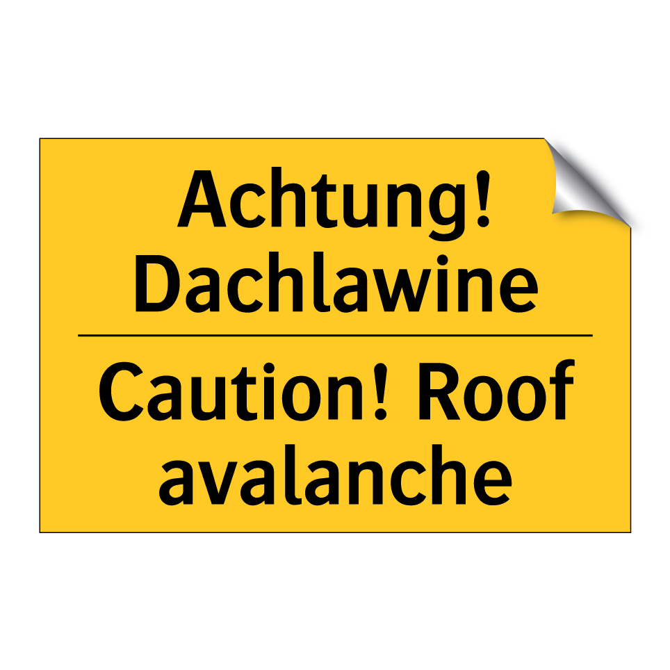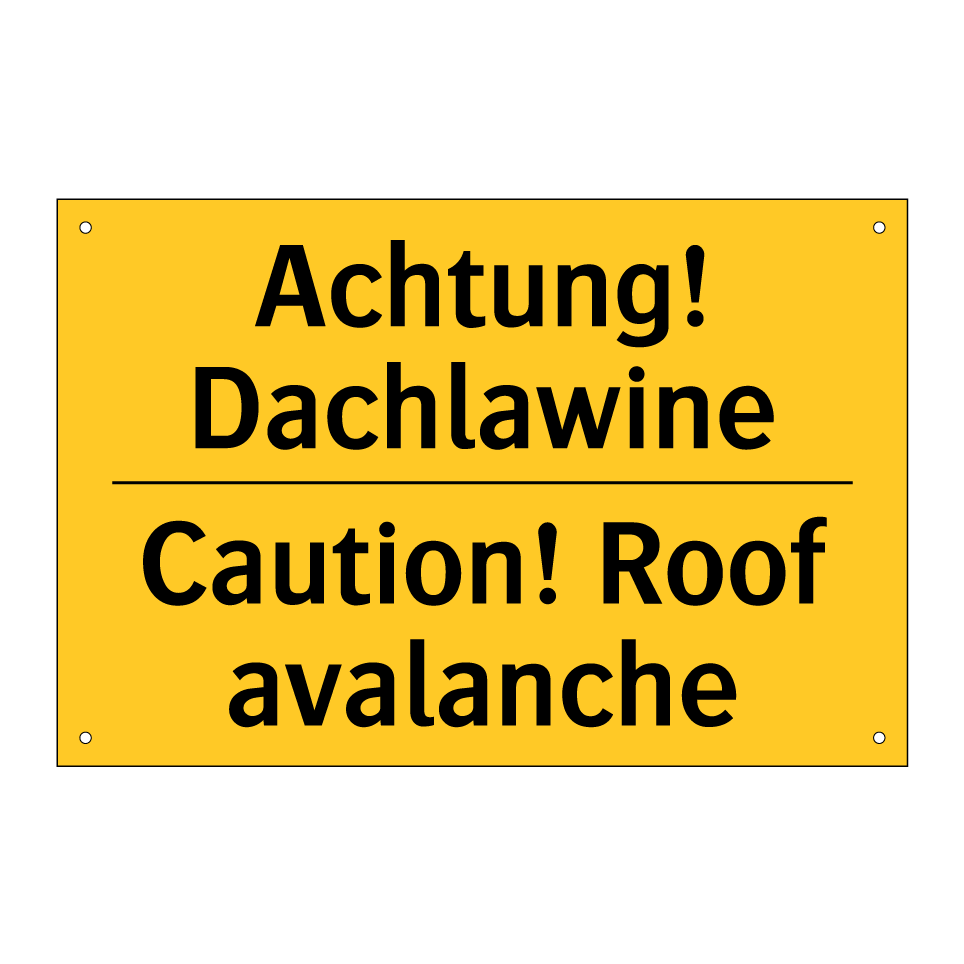 Zweisprachiges Warnschild mit deutschem Text Achtung! Dachlawine und englischem Text Caution! Roof avalanche