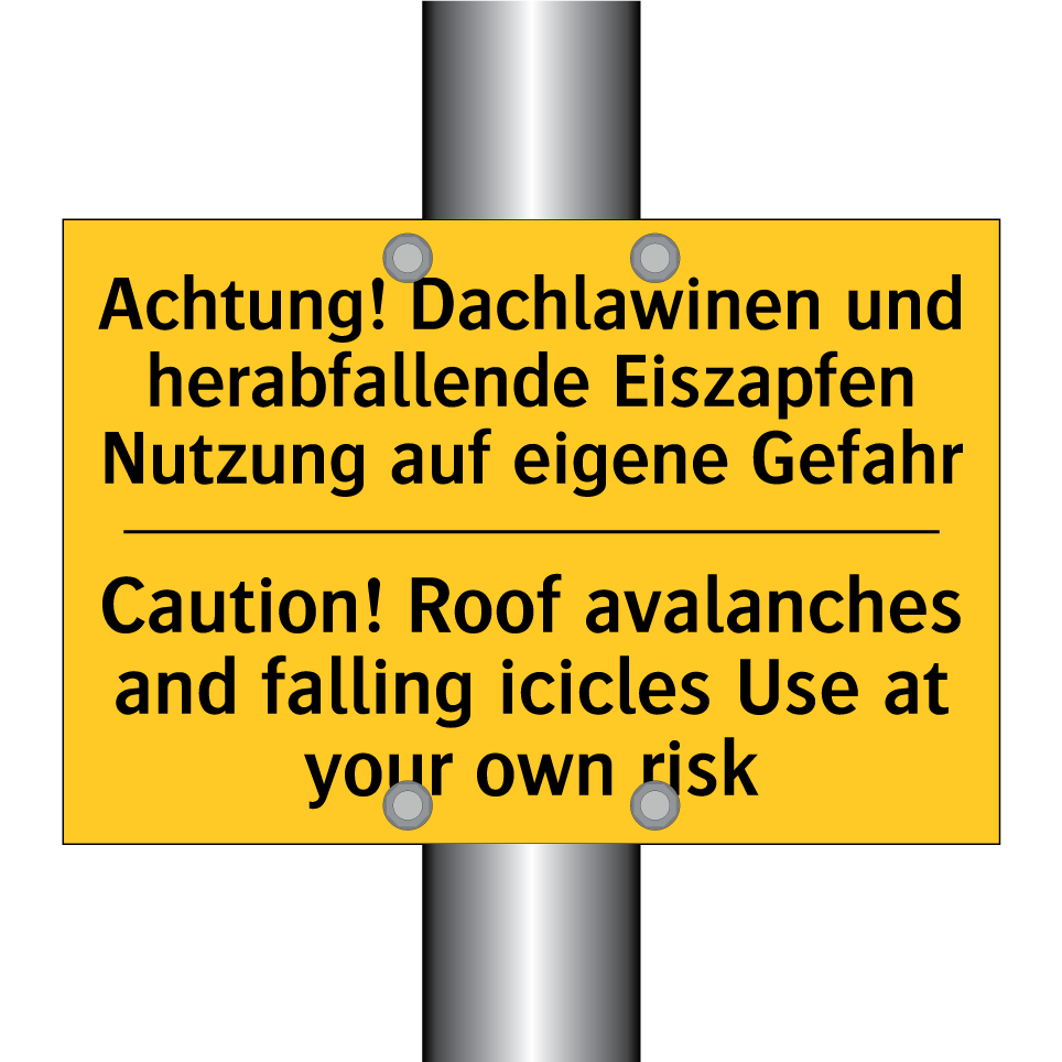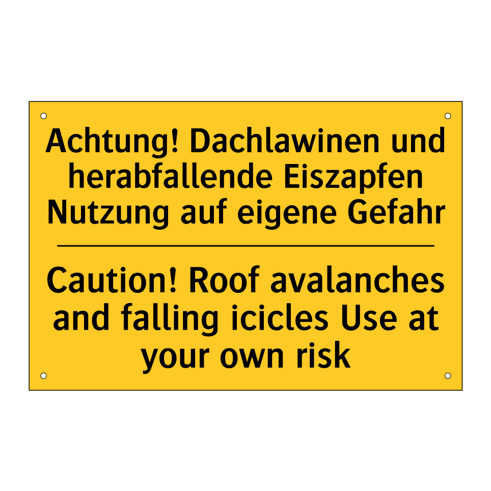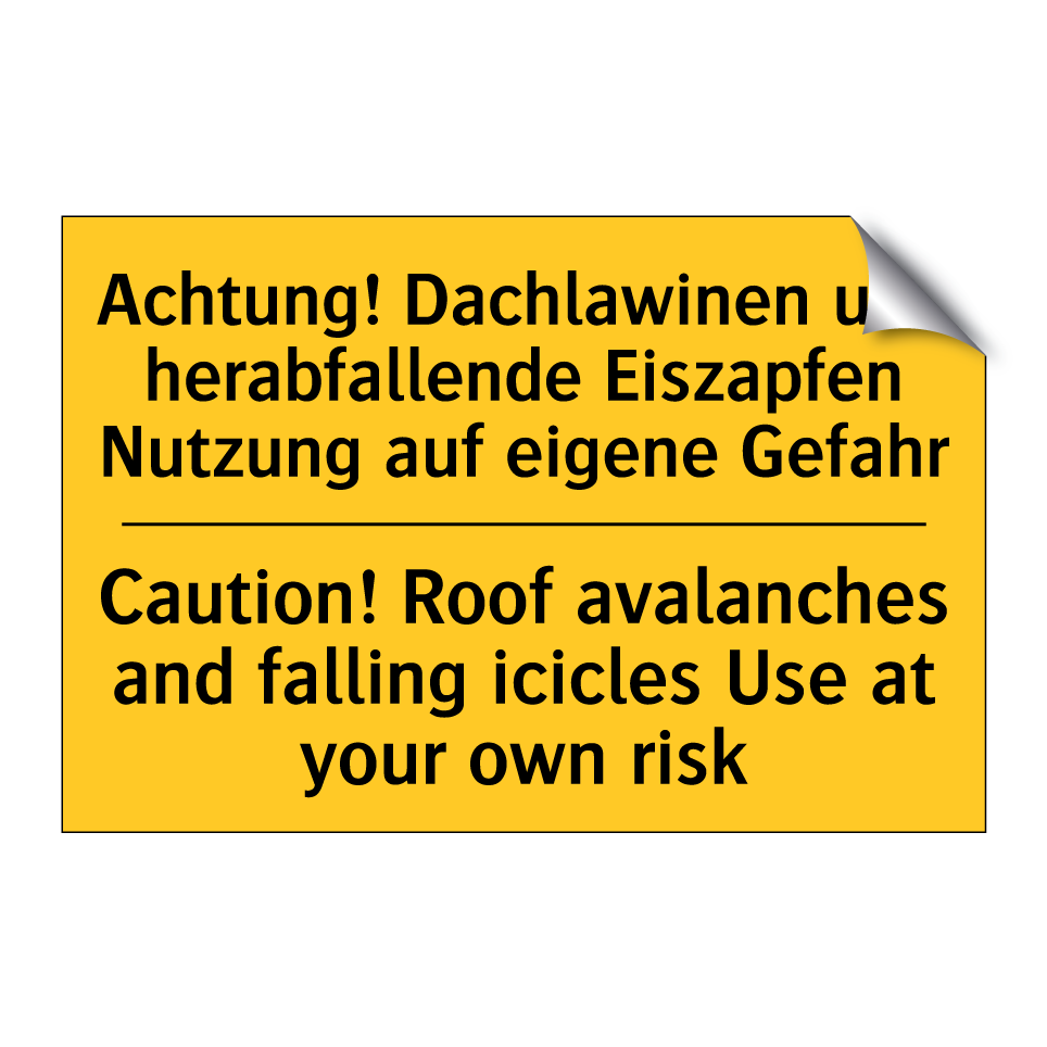 Zweisprachiges Warnschild mit deutschem Text Achtung! Dachlawinen und herabfallende Eiszapfen Nutzung auf eigene Gefahr und englischem Text Caution! Roof avalanches and falling icicles Use at your own risk