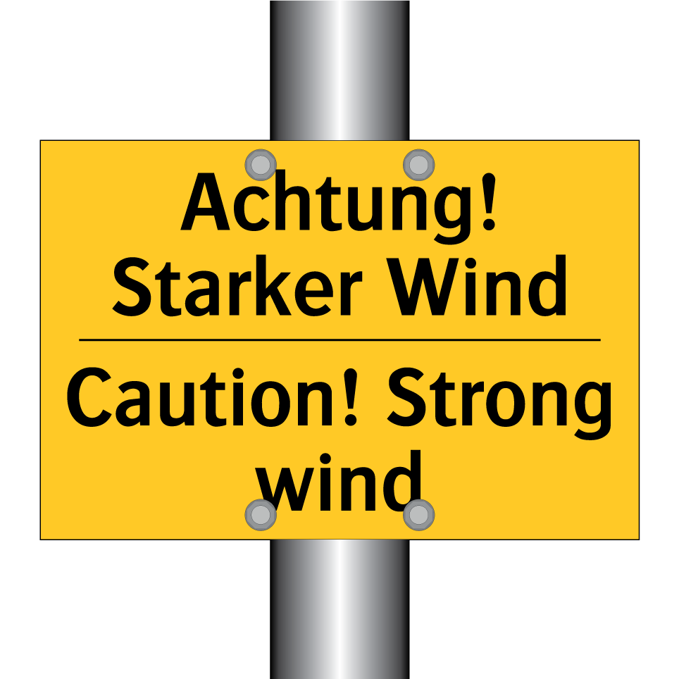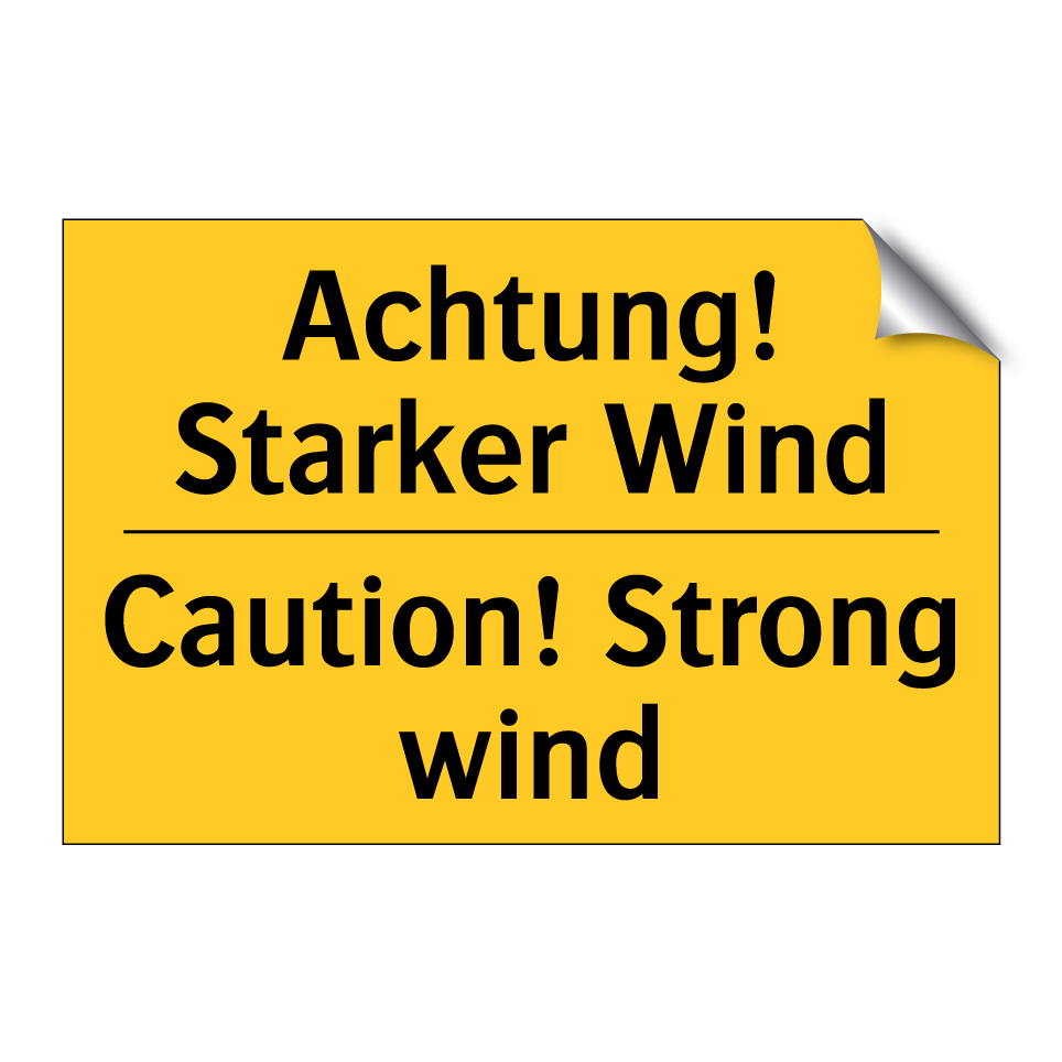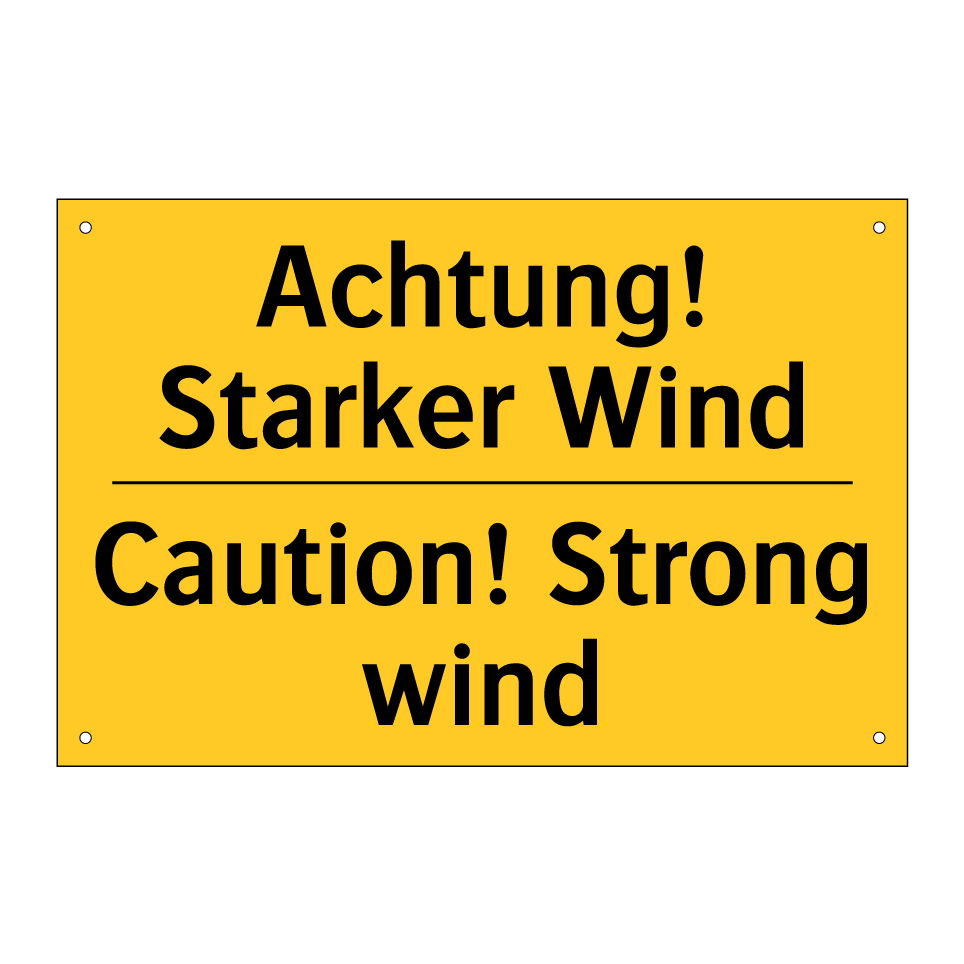 Zweisprachiges Warnschild mit deutschem Text Achtung! Starker Wind und englischem Text Caution! Strong wind