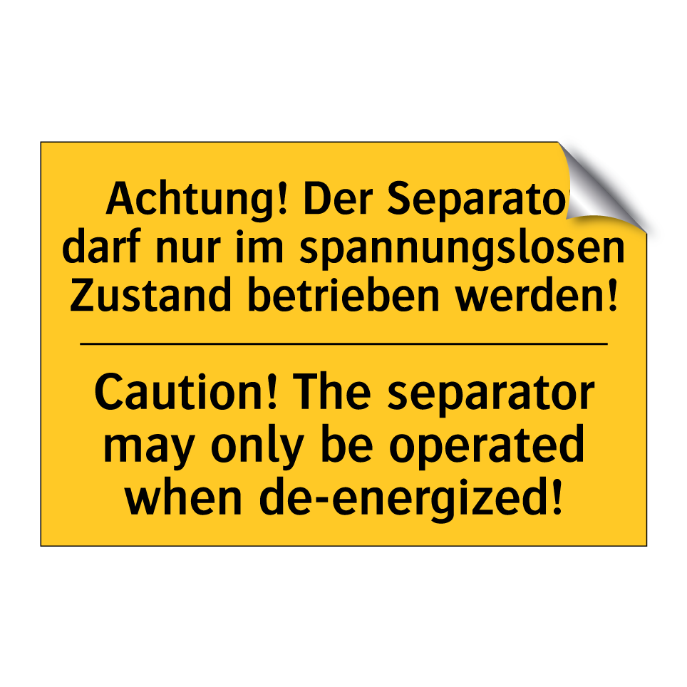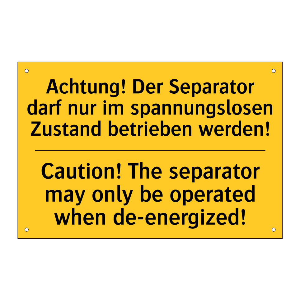 Zweisprachiges Warnschild mit deutschem Text Achtung! Der Separator darf nur im spannungslosen Zustand betrieben werden! und englischem Text Caution! The separator may only be operated when de-energized!