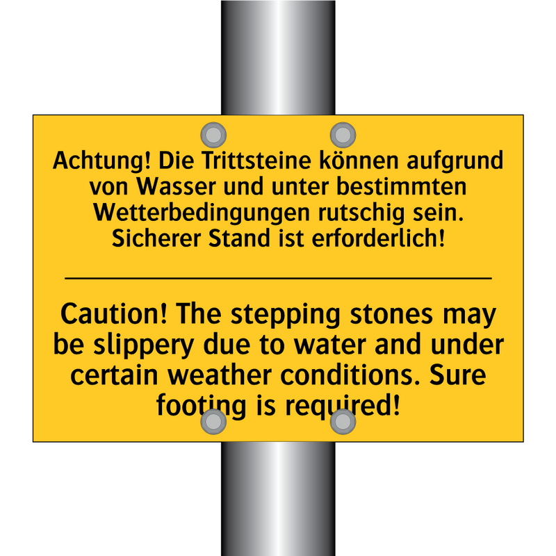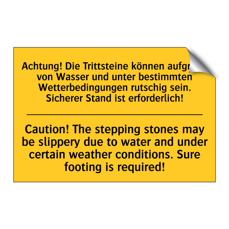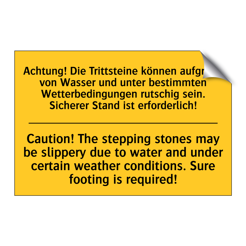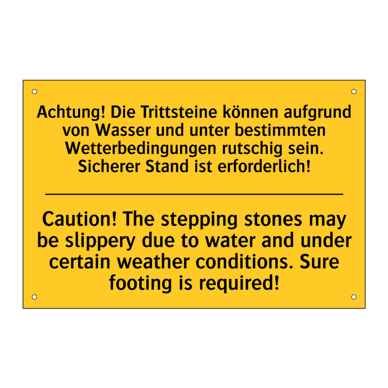 Zweisprachiges Warnschild mit deutschem Text Achtung! Die Trittsteine können aufgrund von Wasser und unter bestimmten Wetterbedingungen rutschig sein. Sicherer Stand ist erforderlich! und englischem Text Caution! The stepping stones may be slippery due to water and under certain weather conditions. Sure footing is required!