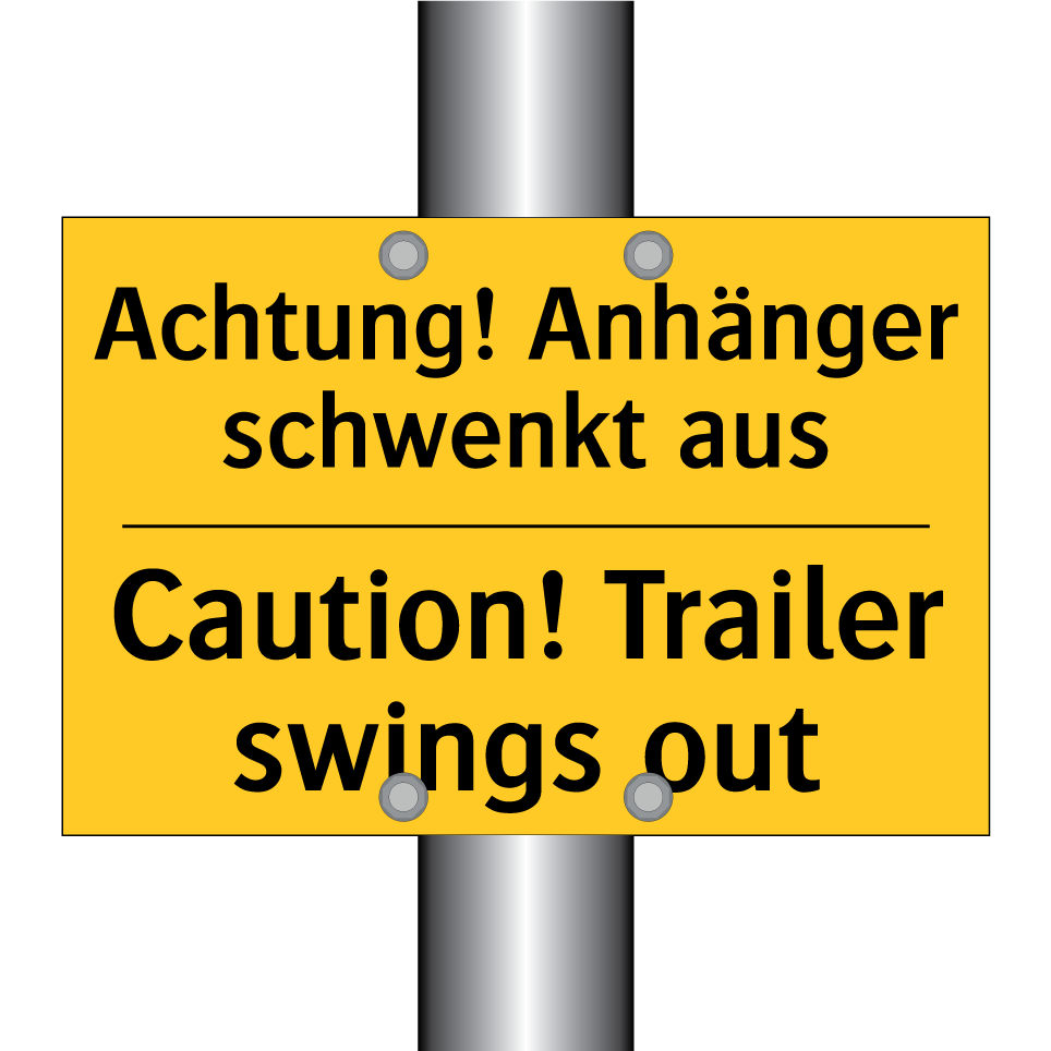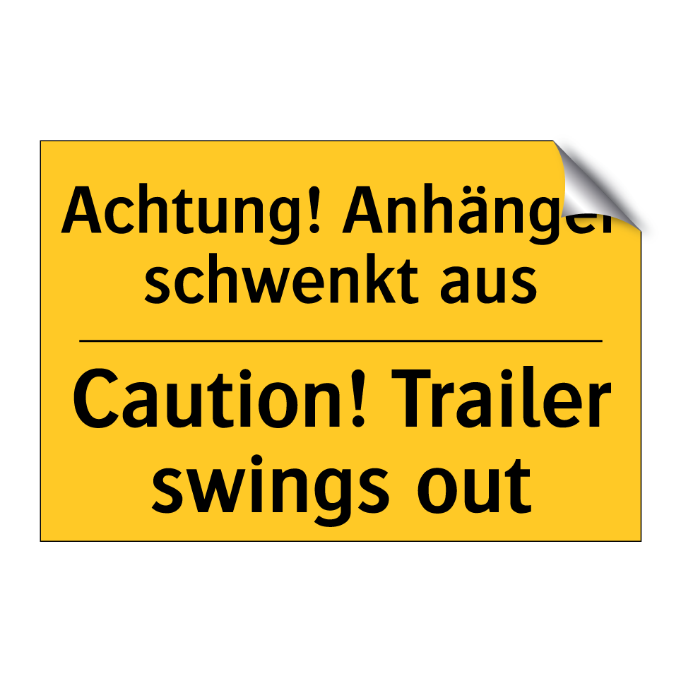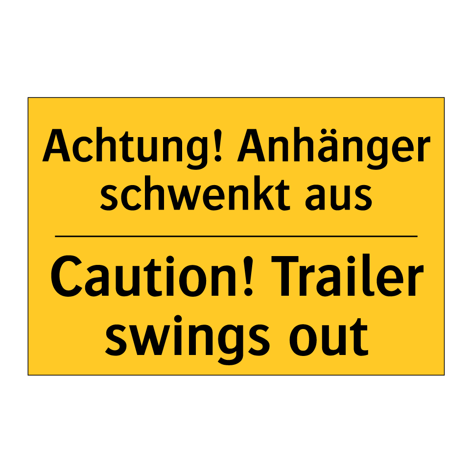 Zweisprachiges Warnschild mit deutschem Text Achtung! Anhänger schwenkt aus und englischem Text Caution! Trailer swings out