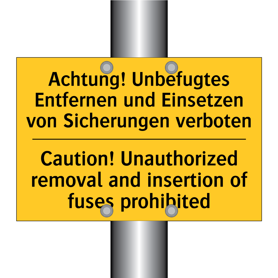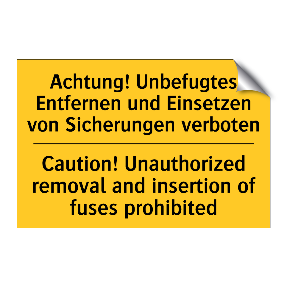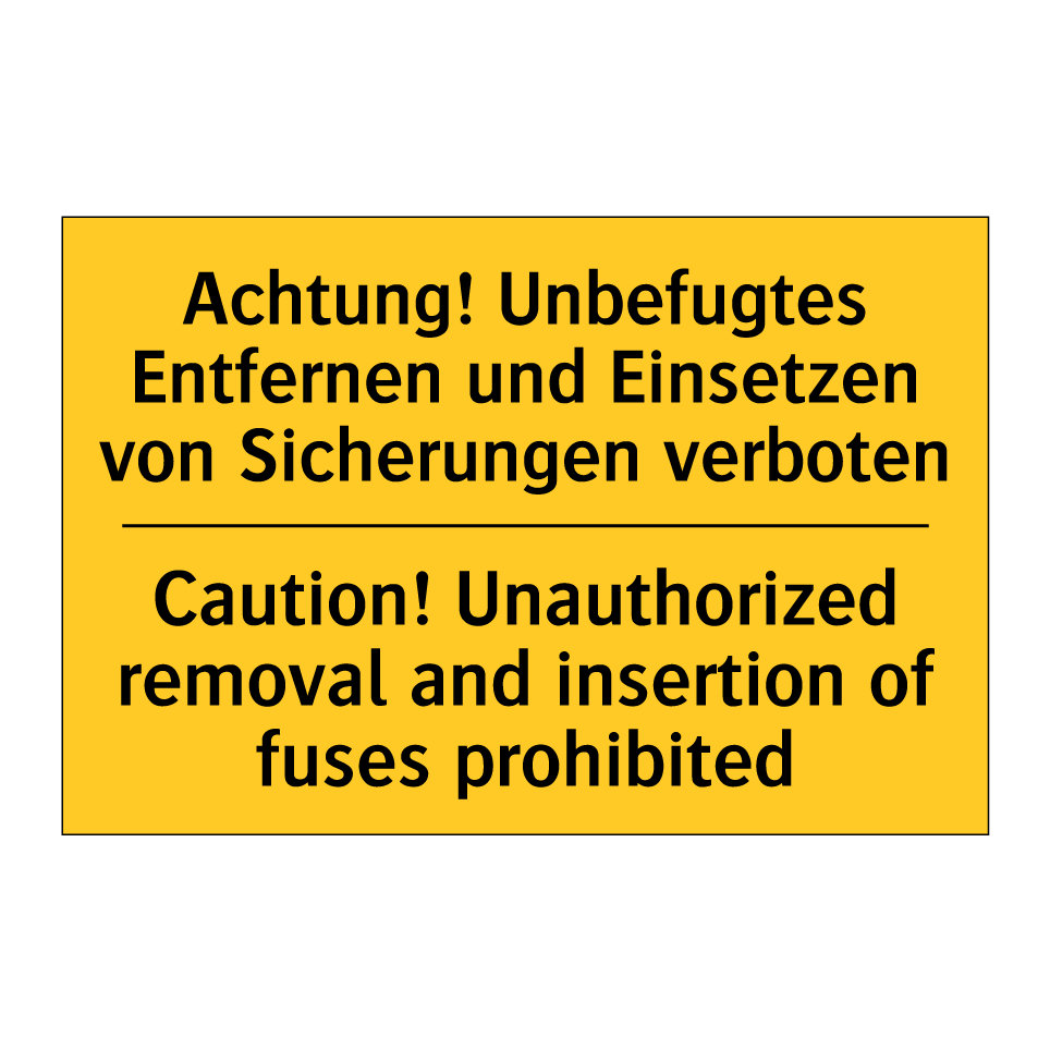 Zweisprachiges Warnschild mit deutschem Text Achtung! Unbefugtes Entfernen und Einsetzen von Sicherungen verboten und englischem Text Caution! Unauthorized removal and insertion of fuses prohibited
