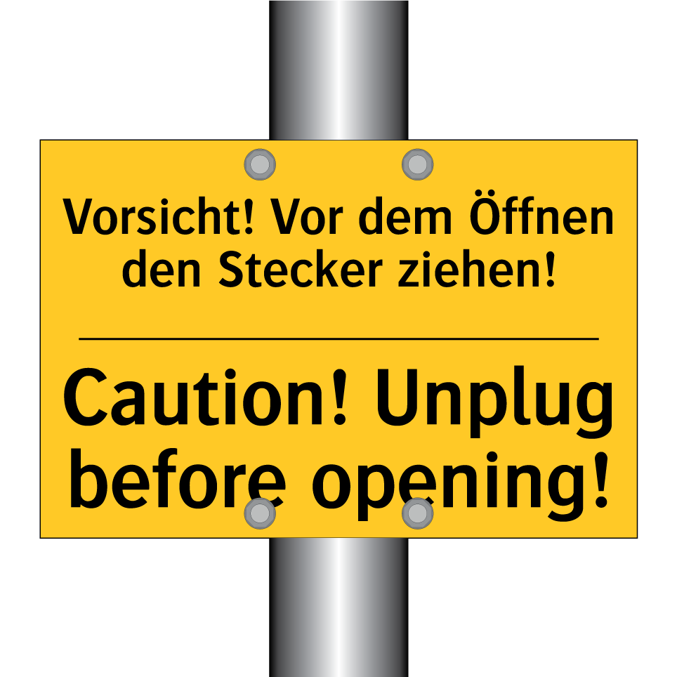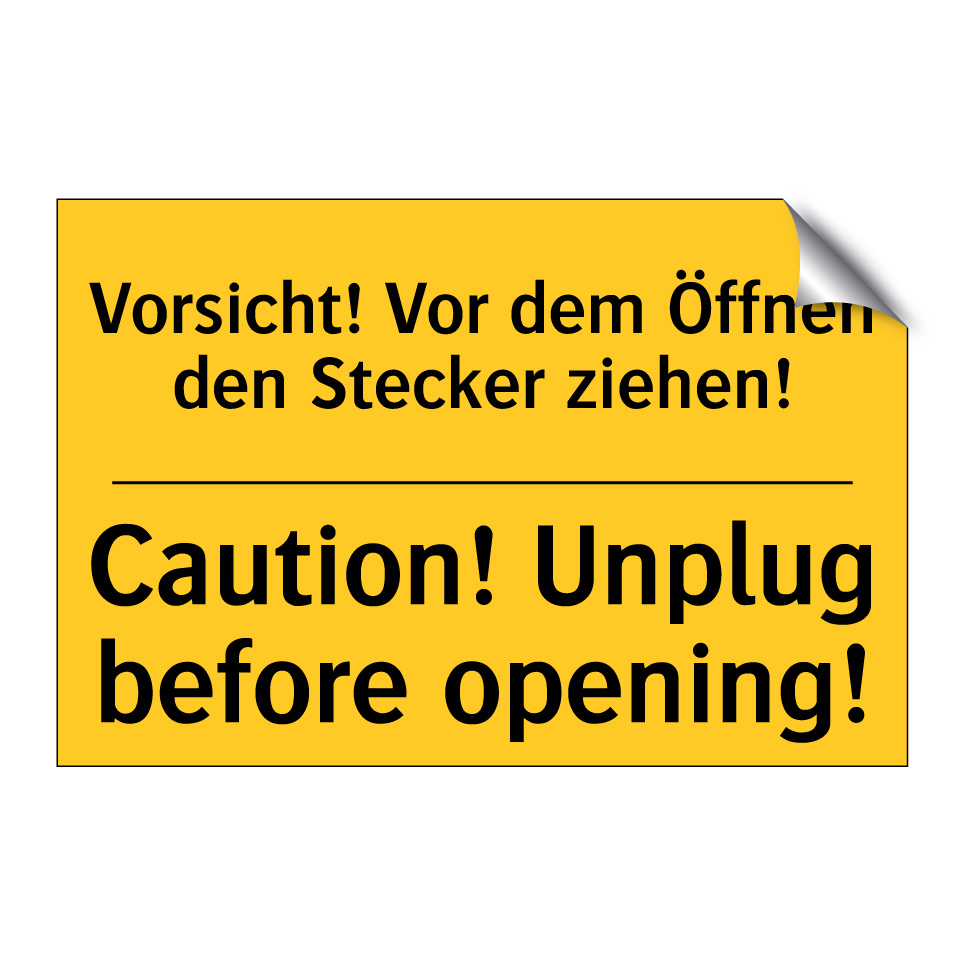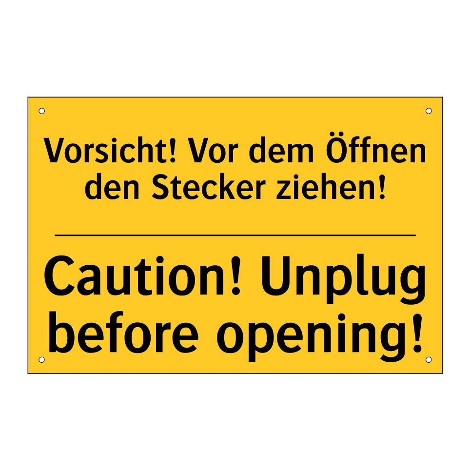 Zweisprachiges Warnschild mit deutschem Text Vorsicht! Vor dem Öffnen den Stecker ziehen! und englischem Text Caution! Unplug before opening!