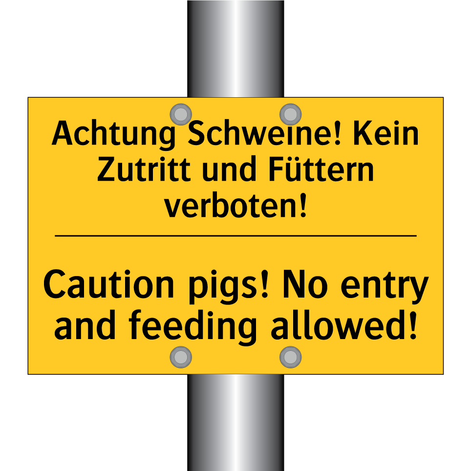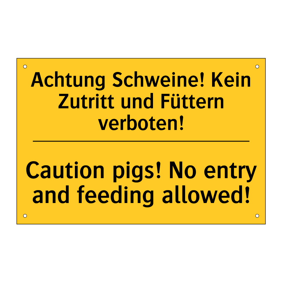 Zweisprachiges Warnschild mit deutschem Text Achtung Schweine! Kein Zutritt und Füttern verboten! und englischem Text Caution pigs! No entry and feeding allowed!