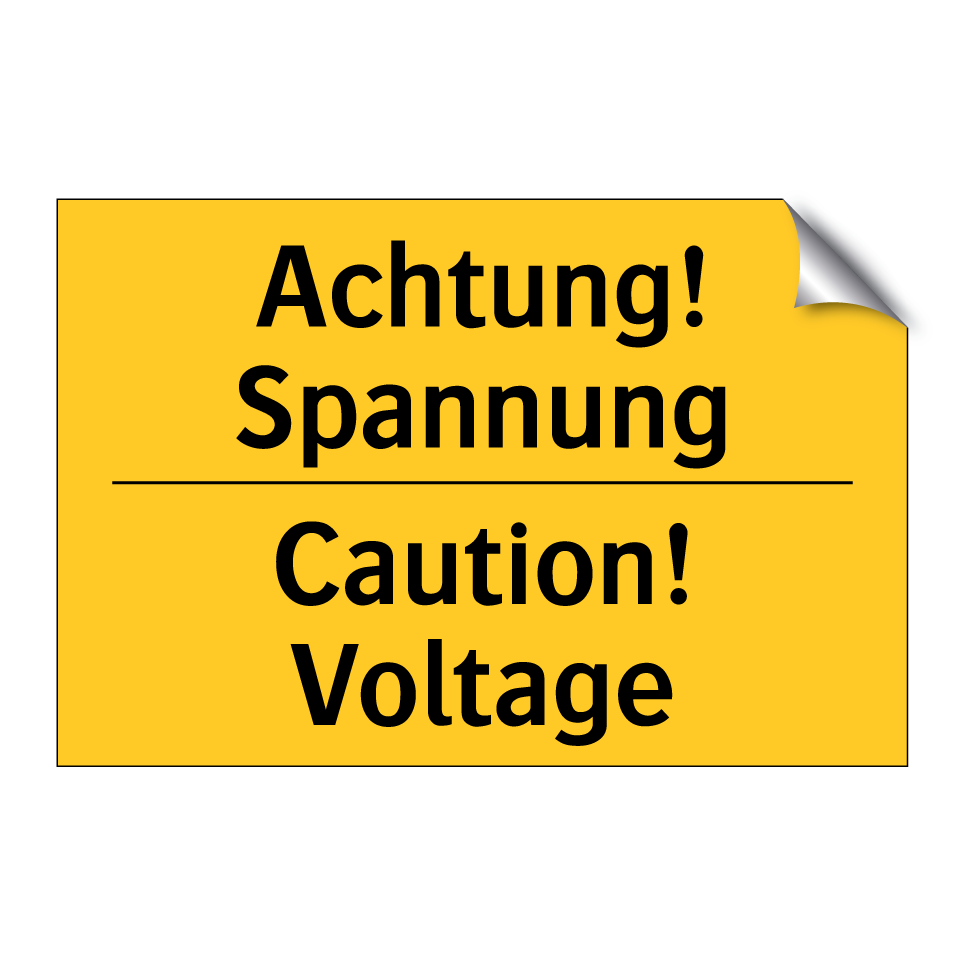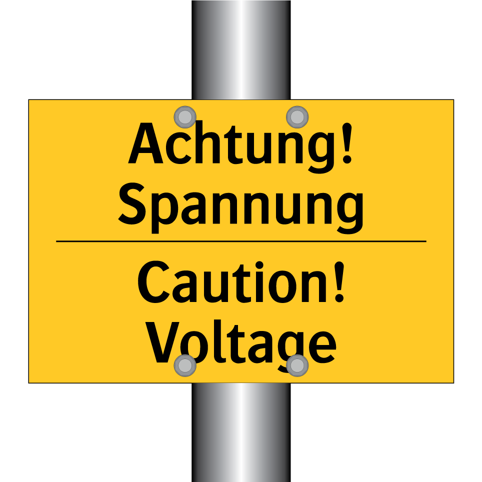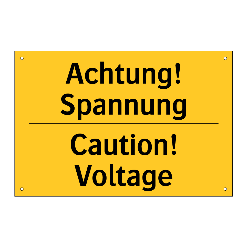 Zweisprachiges Warnschild mit deutschem Text Achtung! Spannung und englischem Text Caution! Voltage