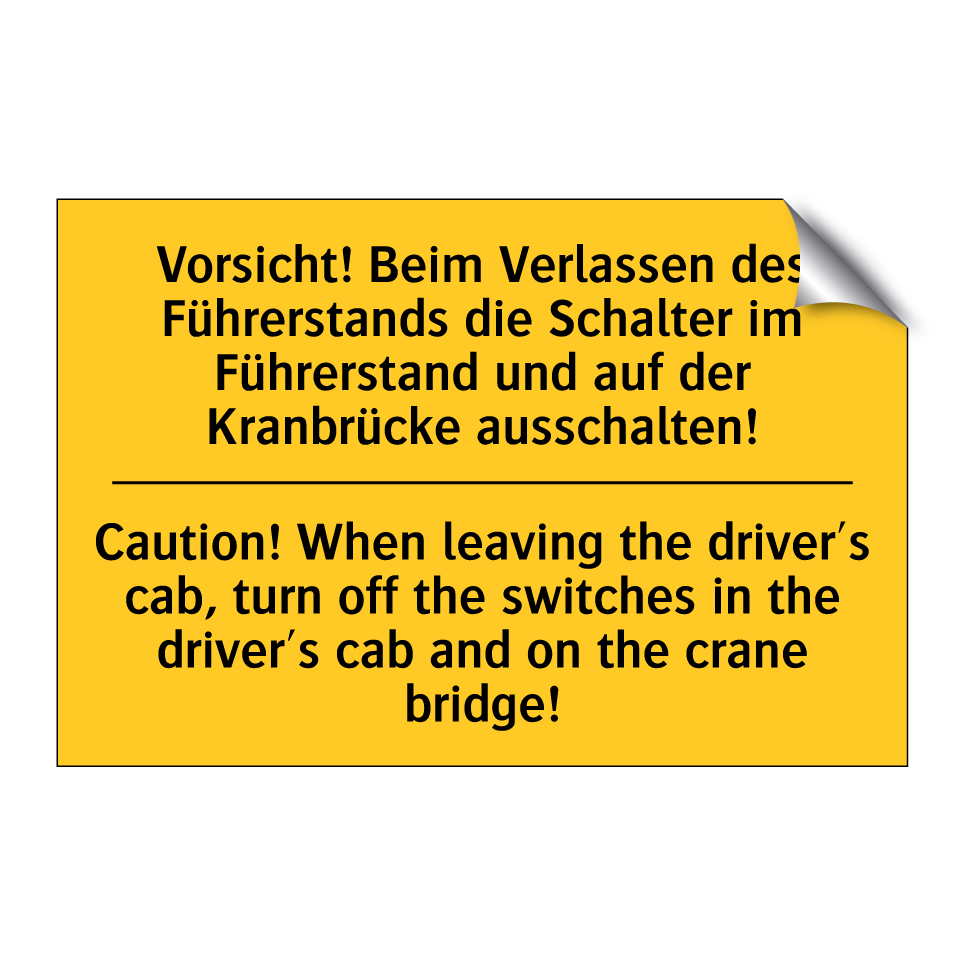 Zweisprachiges Warnschild mit deutschem Text Vorsicht! Beim Verlassen des Führerstands die Schalter im Führerstand und auf der Kranbrücke ausschalten! und englischem Text Caution! When leaving the driver's cab, turn off the switches in the driver's cab and on the crane bridge!
