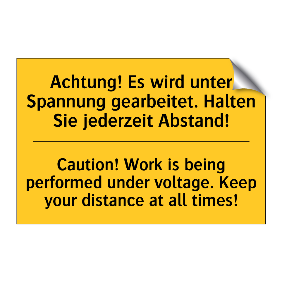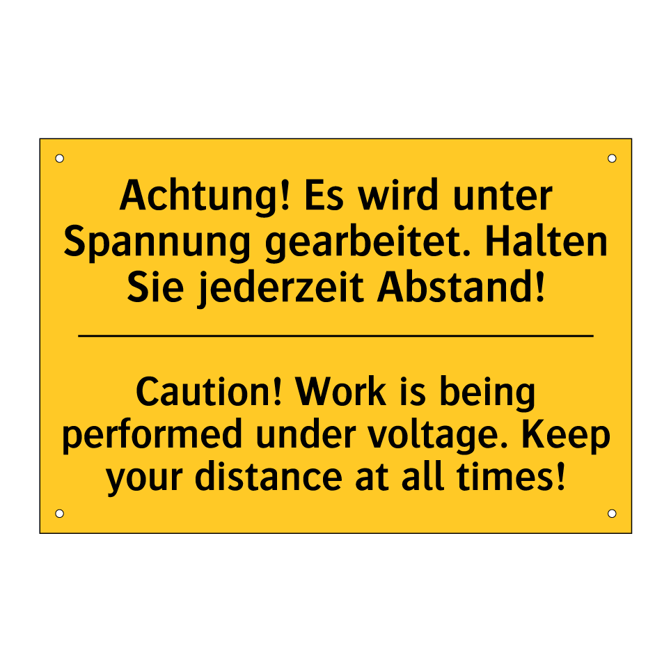 Zweisprachiges Warnschild mit deutschem Text Achtung! Es wird unter Spannung gearbeitet. Halten Sie jederzeit Abstand! und englischem Text Caution! Work is being performed under voltage. Keep your distance at all times!