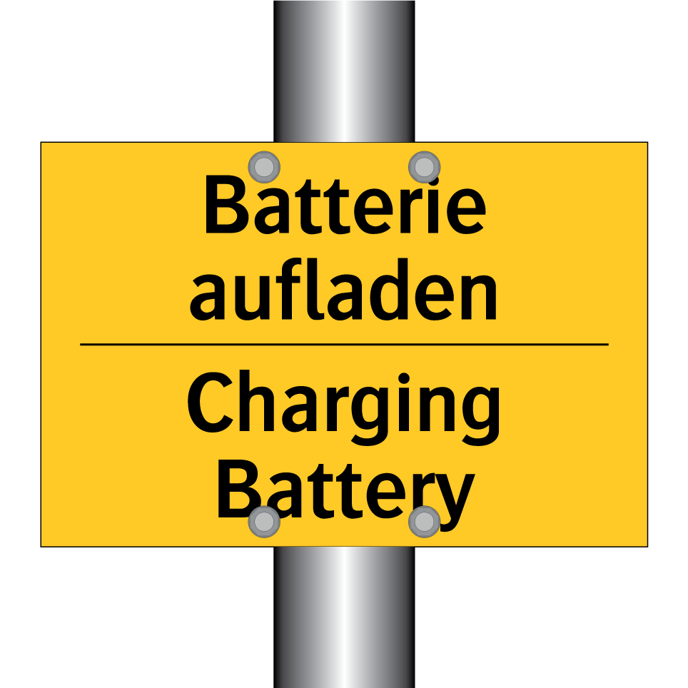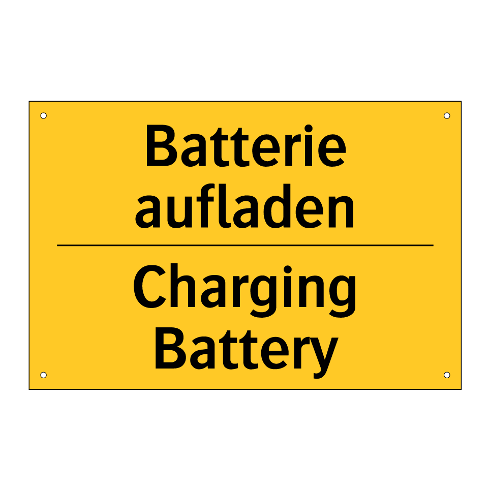 Zweisprachiges Warnschild mit deutschem Text Batterie aufladen und englischem Text Charging Battery